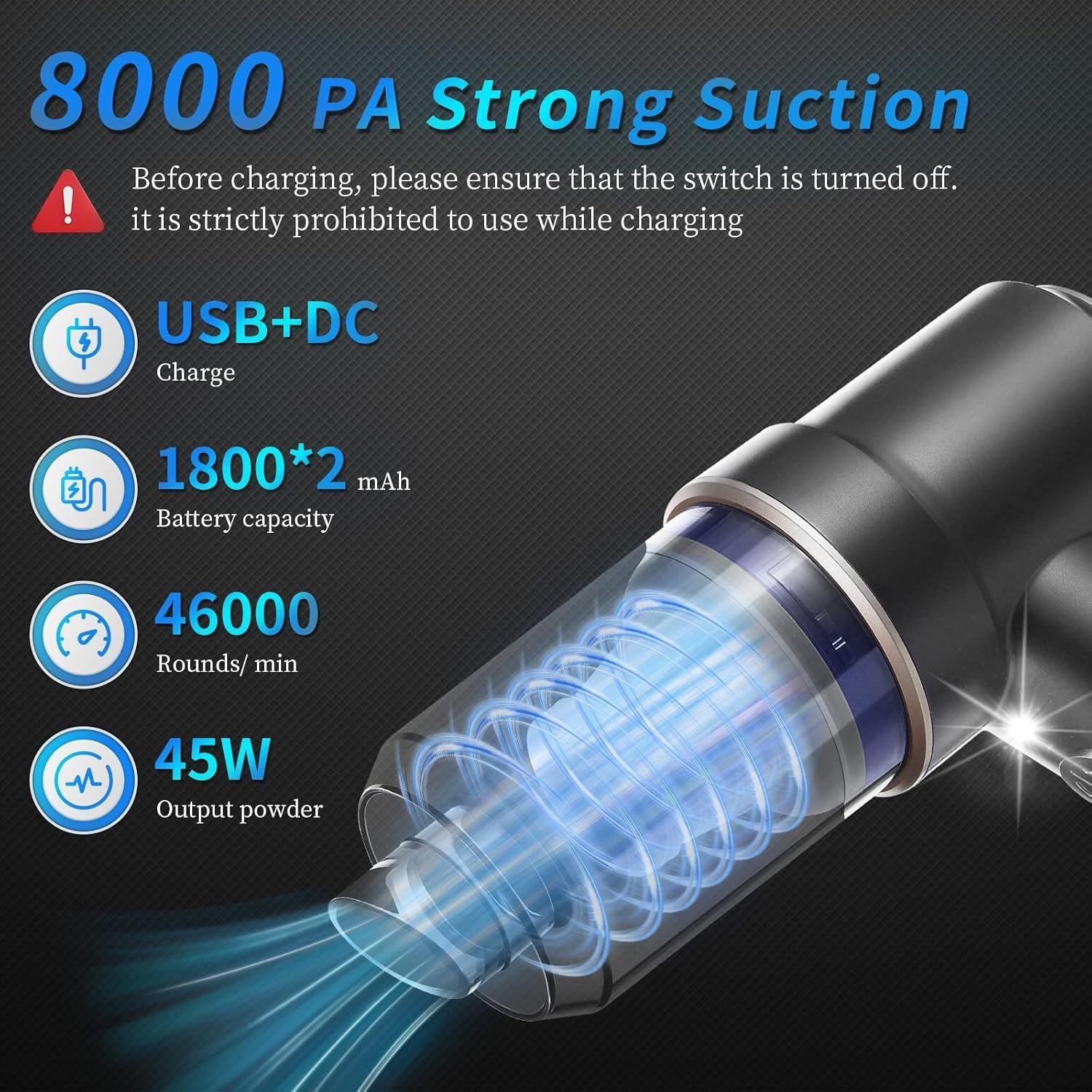 High-Power Suction (12000Pa): Provides powerful suction to capture dust and debris effortlessly.Cordless Convenience: Operates without a power cord, allowing unrestricted movement and easy handling.USB Charging: Equipped with USB charging capabilities, making it convenient to recharge anywhere.Long Battery Life: A 2400mAh lithium battery is powered for extended usage without frequent recharging.Compact and Lightweight: It is small, portable, and easy to carry, ideal for quick cleanups in various settings.