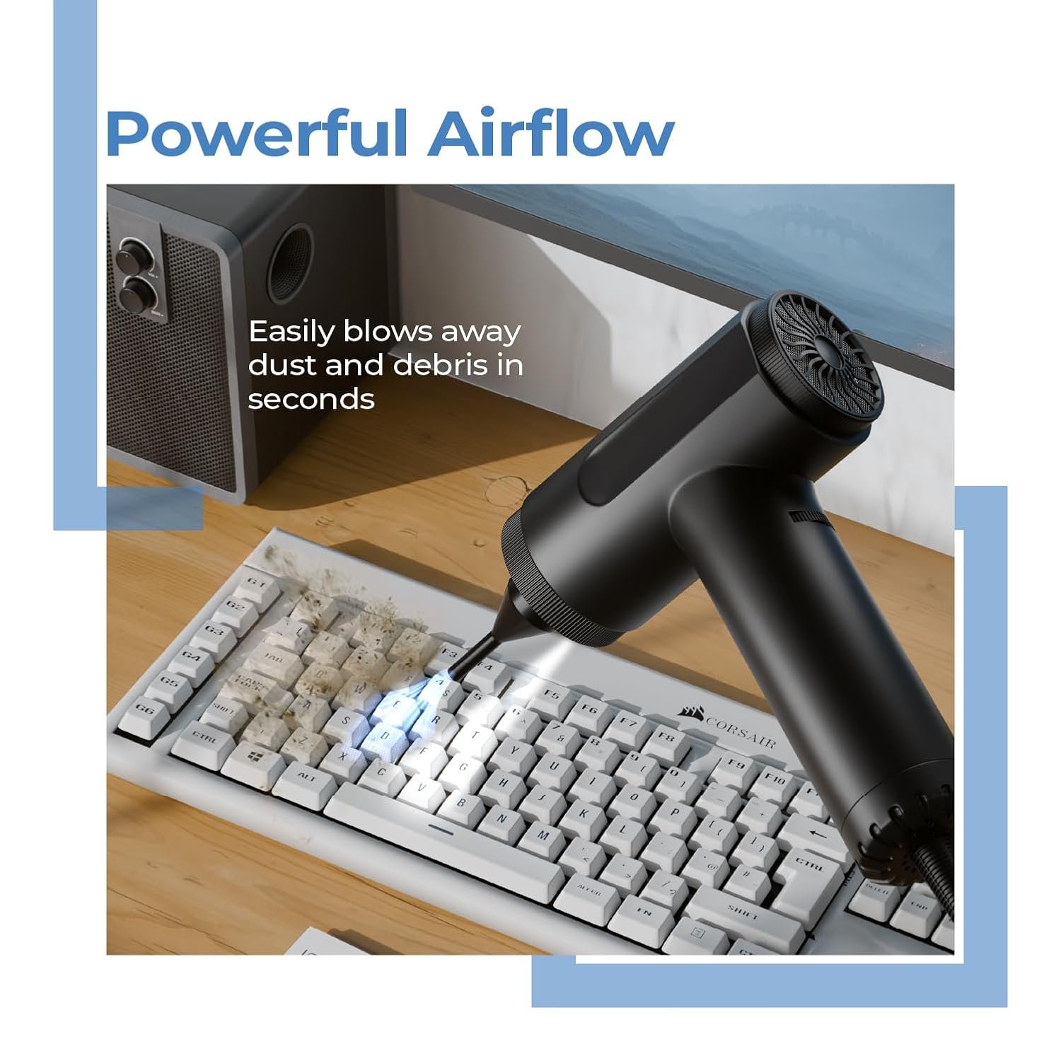 Powerful Air Blower for Dust Removal – Equipped with a high-efficiency brushless motor, this electric air blower delivers strong, stable airflow to quickly eliminate dust and debris from keyboards, electronics, appliances, and more.