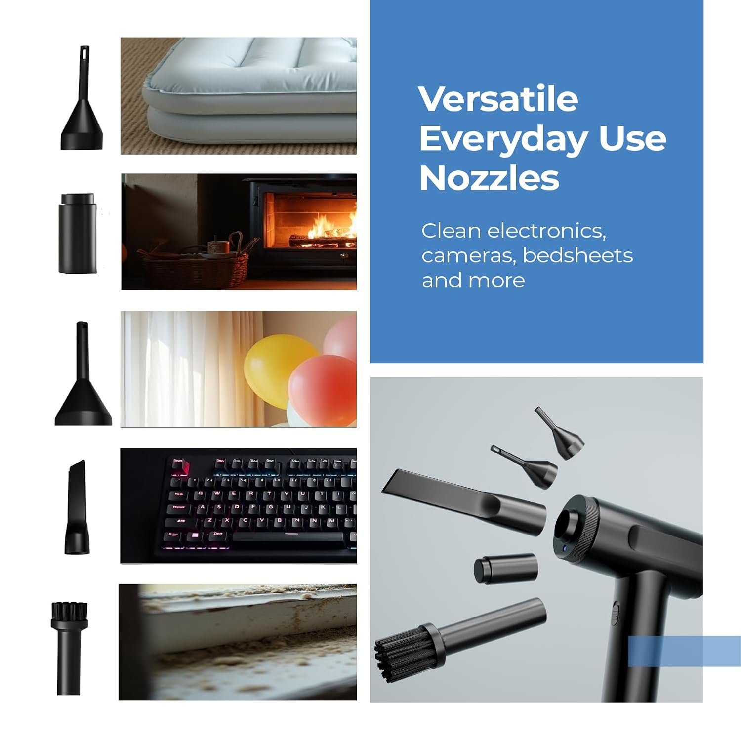 Multi-Functional Cleaning with Nozzles – Includes multiple nozzle attachments for precise cleaning in hard-to-reach areas. Ideal for use on laptops, cameras, car interiors, air conditioners, and home décor.