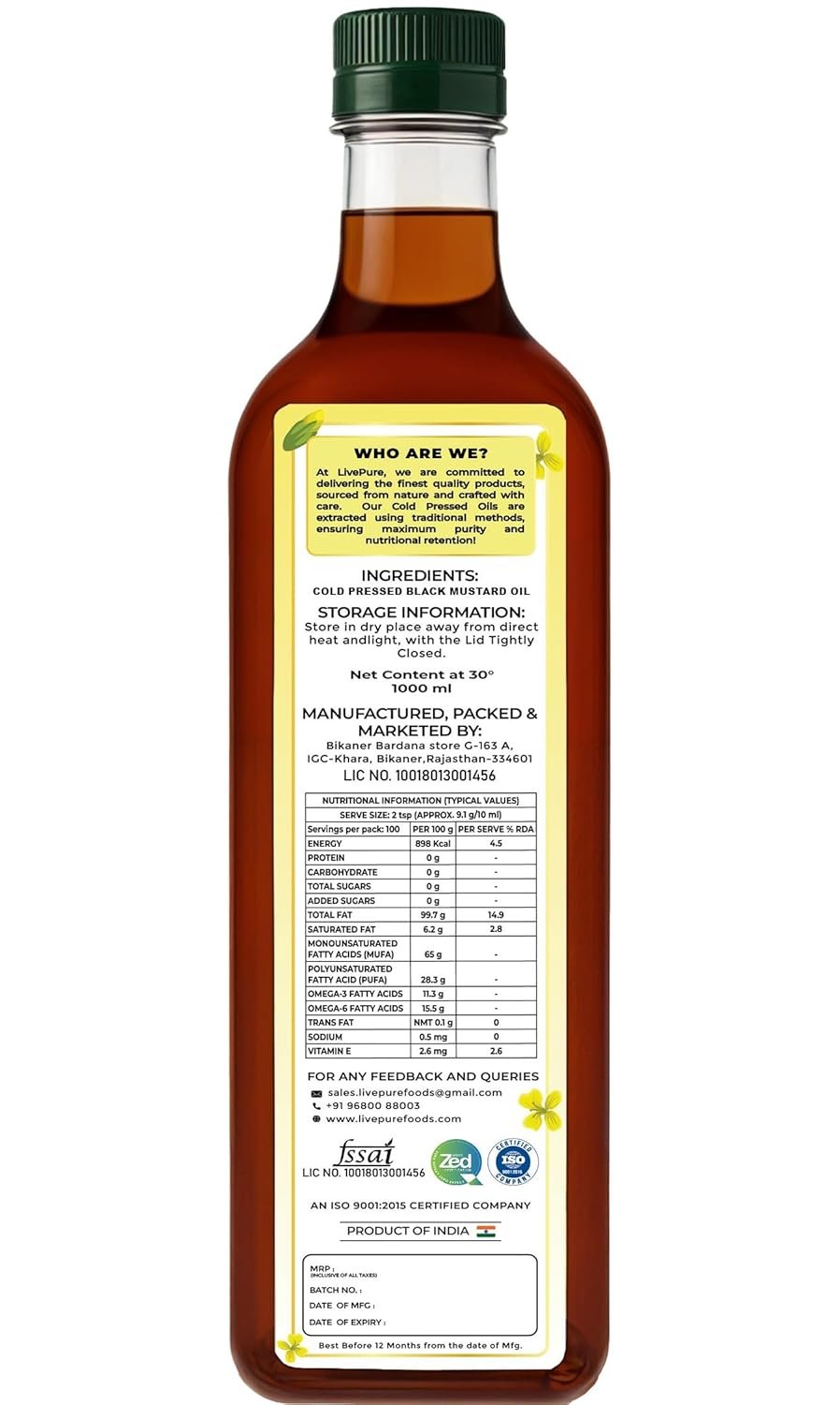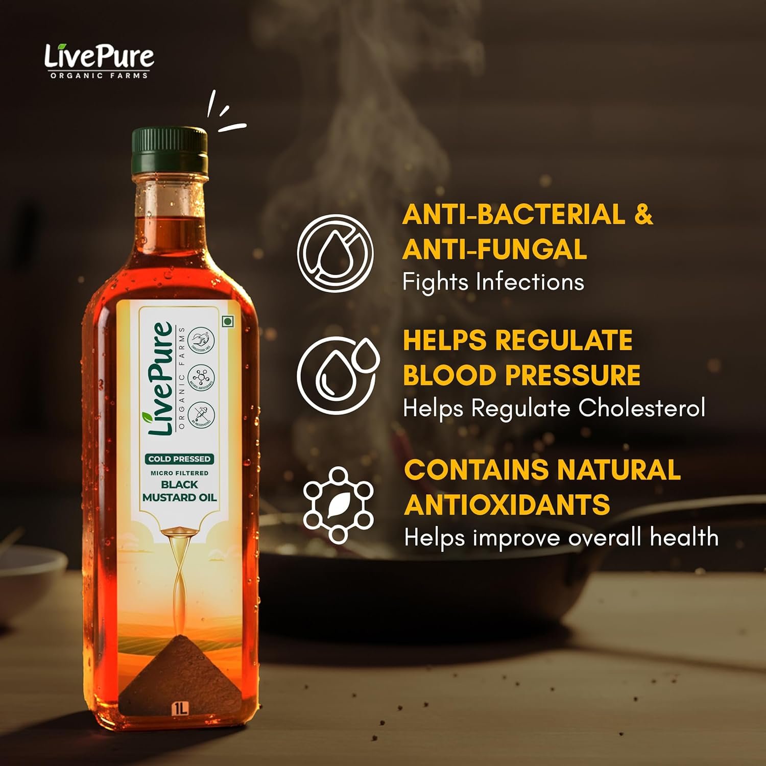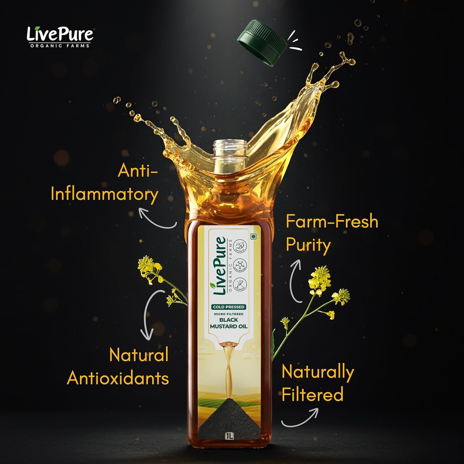 Livepure Organic Farms- Cold Pressed Mustard Oil (1L Pet Bottle), Mustard Oil Cold Pressed | Kacchi Ghani Sarso Oil | Chemical Free| Cholesterol Free | Micro Filtered | Healthy Unrefined Cooking Oil