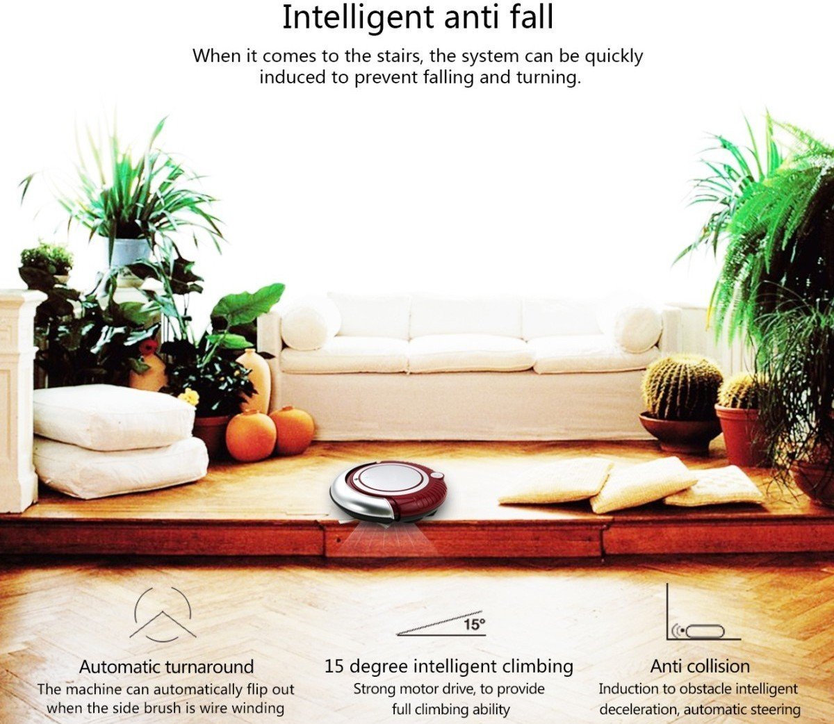 Built-in cliff avoidance sensors prevent falling down stairs. Cliff Sensor allows the robot to avoid stairs and other drop-offs.