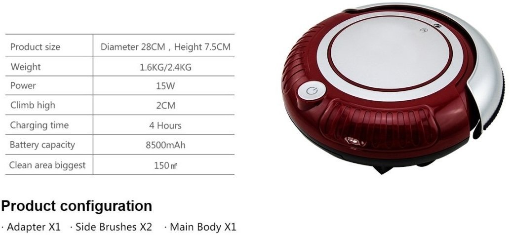 Product name: MA Minivac Robot Vacuum Cleaner Item No: MA-001 Color: Red Features of our Minivac: 1. A completely automatic cleaner: Press only one button and the robot will start cleaning. 2. Compact shape enables it to clean hard-to-reach places. 3. Three kinds of cleaning modes (Spot cleaning, Edge cleaning and Auto cleaning) ensures that it covers the entire place to be cleaned. 4. Works quietly. 5. Built-in cliff avoidance sensors prevent falling down stairs. Cliff Sensor allows the robot to avoid stairs and other drop-offs. 6. Soft bumper strongly protects both the robot and your furniture. 7. Safety power off function: If the wheels are stuck, it will power off off automatically, which is safe and energy saving. 8. Removable side brushes. 9. Flashing LED lights in the illumination ring make the robot look amazing while working. 10. The robot cleans the areas you see and those you can’t, including under and around your furniture. 11. Double Side brushes enlarge cleaning area. 12. With Electrostatic dust paper, the mini robot can do both vacuuming and mopping. 13. Big capacity of rechargeable battery 850 MAH nickel metal hydride battery, continuously works for 55 minutes on a 4 hour charge. Package contains: 1X Robot Vacuum Cleaner 1X Dusting paper holder 1X Adapter 1X Rechargeable battery 2X Side brushes 3X Dusting paper 1X Operation manual 2X Filter nets: One filter net in the cleaner One replacement filter net in the package Specifications of our Minivac: Size: Diameter: 28 cm, Height: 7.5 cm, Weight: 1.6 kg Applications of our Minivac: Short-haired carpet, Wooden floor, Tile floor , Terrazzo floor Certifications of our Minivac: CB/GS/UL&cUL/CE/ROHS/PSE