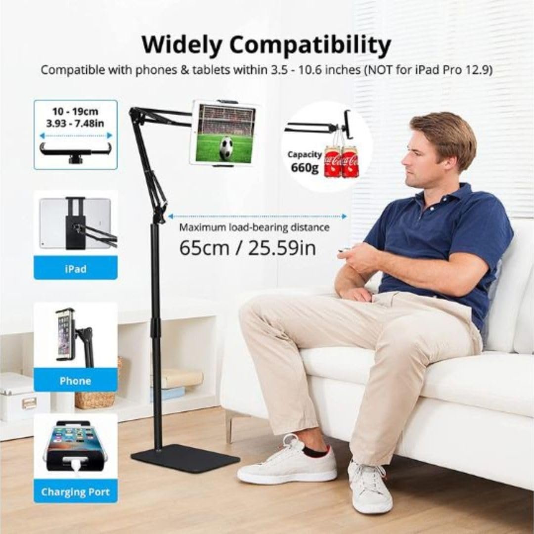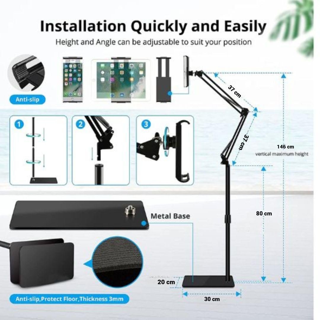 Our Tablet floor stand can be 360-degree rotation for easy adjusting any angle, allows you to comfortably watch movies, videos, recipes, guitar spectrum, etc.