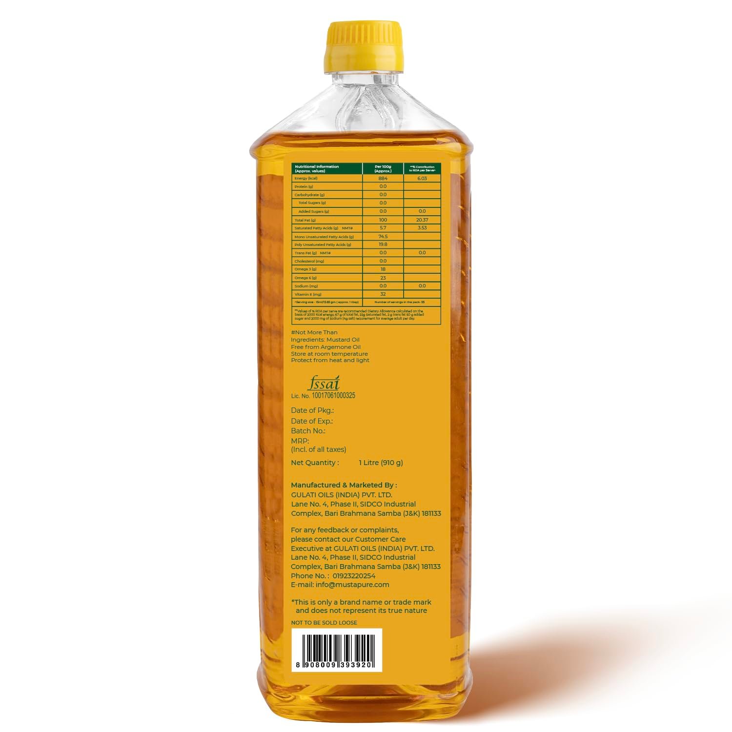 Food Grade Packaging – MustaPure Yellow Mustard Oil is packaged in certified food grade packaging material adhering to the highest food safety standards.