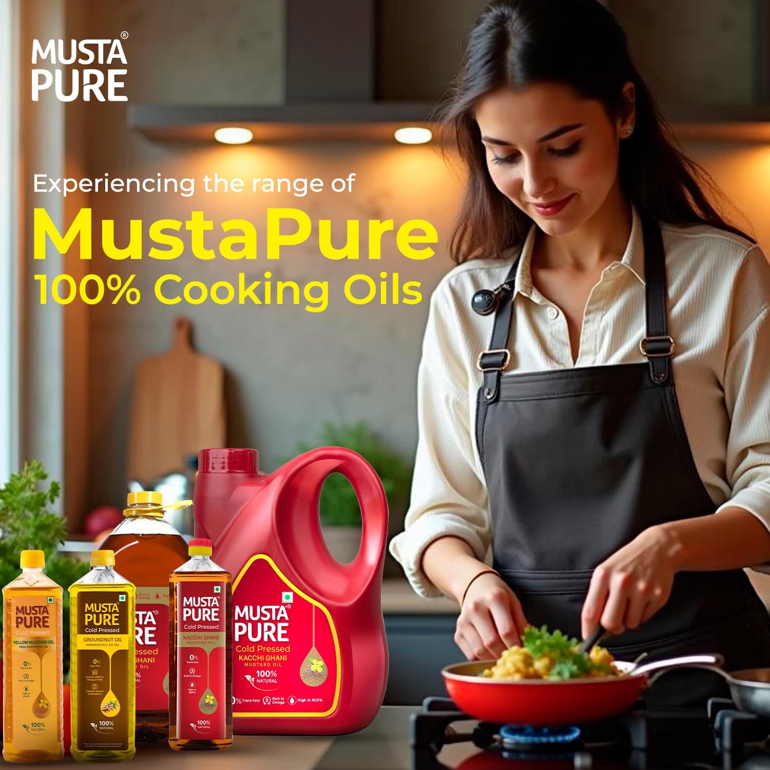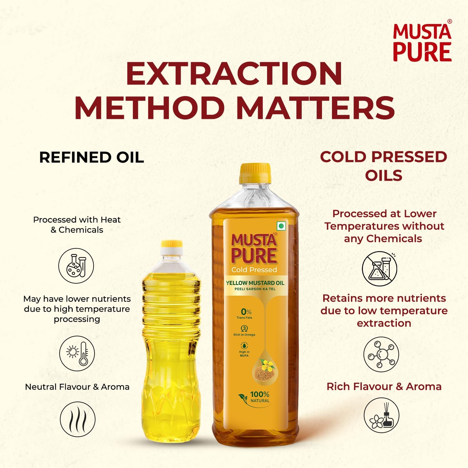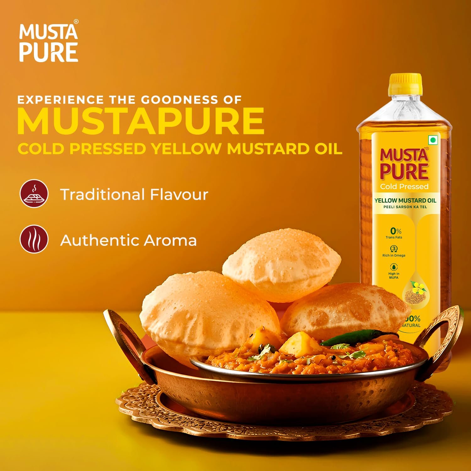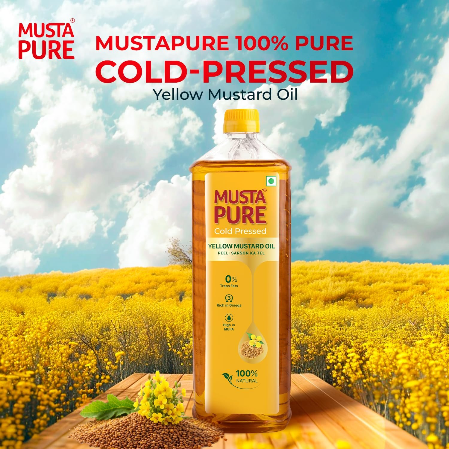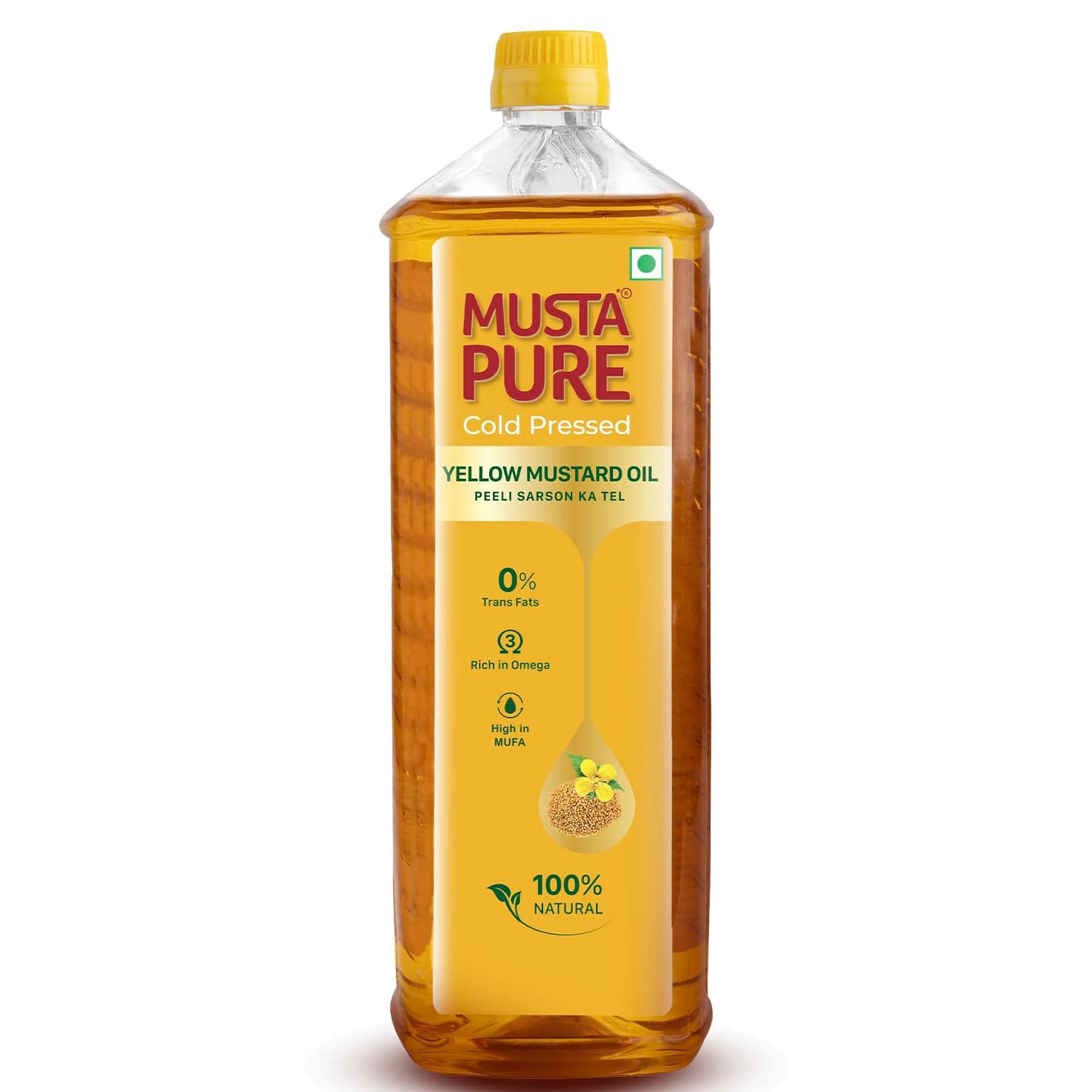 MustaPure brings you the goodness of purity and tradition with a promise of uncompromising quality. Rooted in sustainable practices and crafted with care, MustaPure is dedicated to delivering the finest cooking oils that are as healthy as they are flavorful. Our Yellow Mustard Oil, made from A1 grade yellow mustard seeds, is extracted using the cold-pressed method to retain its natural nutrients and authentic aroma. Rich in Omega-3 and High in MUFA, it is naturally cholesterol-free and trans fats free making it a super healthy choice. Its flavor elevates every dish, making it perfect for frying, sautéing or marinating. Delivered in a food grade eco-friendly, recyclable packaging, MustaPure embodies purity, nutrition, and sustainability in every drop, ensuring your kitchen is stocked with the best.