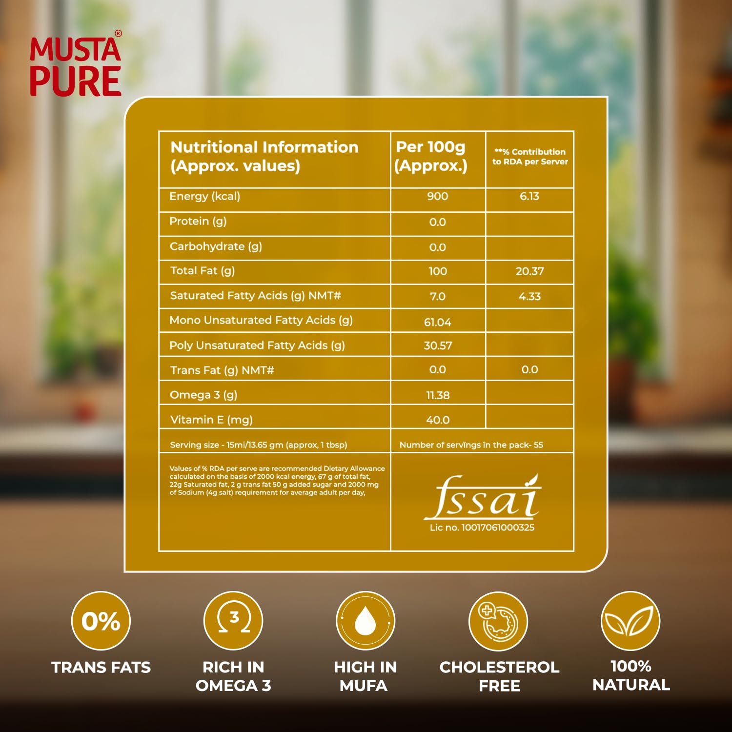 Health Advantage – MustaPure Yellow Mustard Oil contains Mono Unsaturated Fatty Acid (MUFA) and Alpha Linolenic Acid that helps to maintain blood cholesterol levels.