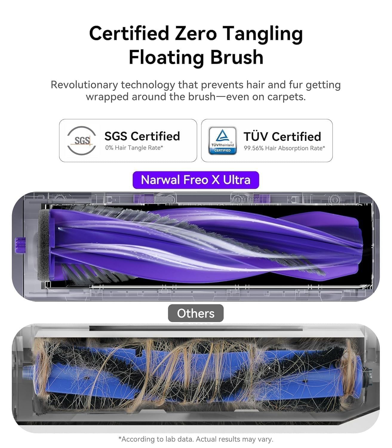 🟣 Zero Tangling Brush – A revolutionary innovation that holds a conical cleaning brush on a single floating arm. Instead of getting trapped, hair and pet fur are passed directly into the dust bag. SGS and TÜV certified, Freo X Ultra has a 0% tangle rate with 99.5% of hair getting instantly removed.