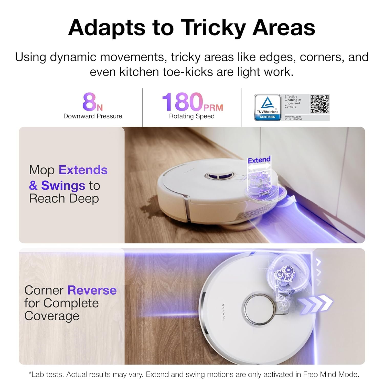 EdgeReach Mop Extension + EdgeSwing Technology Reaches deep into corners and edges for a thorough mopping experience.