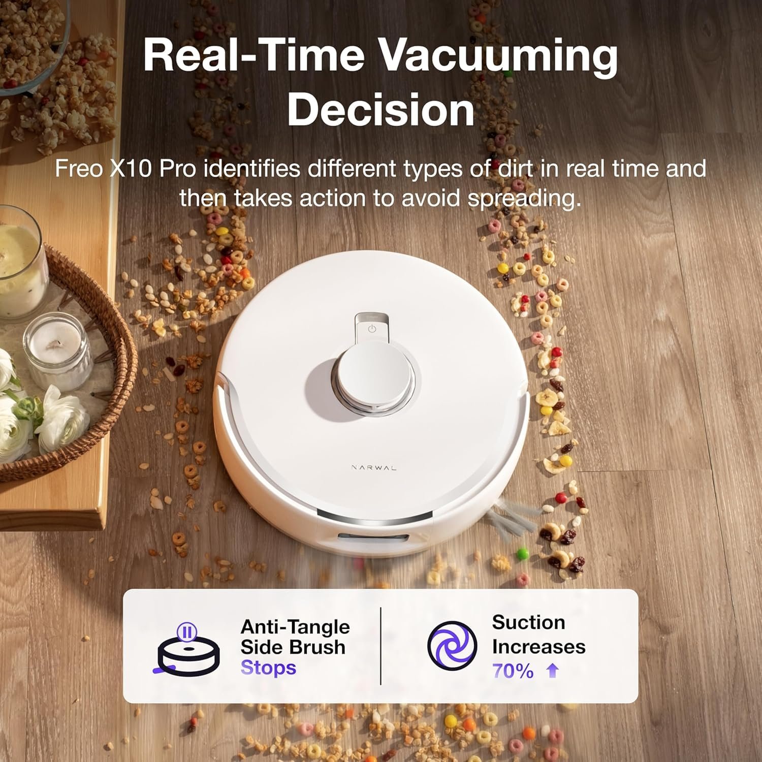 Relieve the stress of detangling with Narwal Freo X10 Pro. The side brushes and floating roller brush are cleverly engineered to prevent hair from getting stuck in awkward areas, making maintenance simple and infrequent.