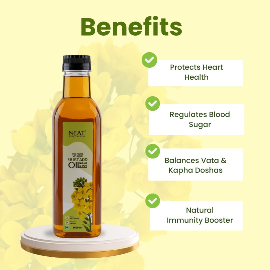 Neat Everyday 100% Cold Pressed Yellow Mustard Oil- 1000 ML | Kachi Ghani Mustard Oil | Healthy Cooking Oil Goodness of Omega 3s | Perfect Blend of Health, Taste & Aroma- Pure & Unrefined