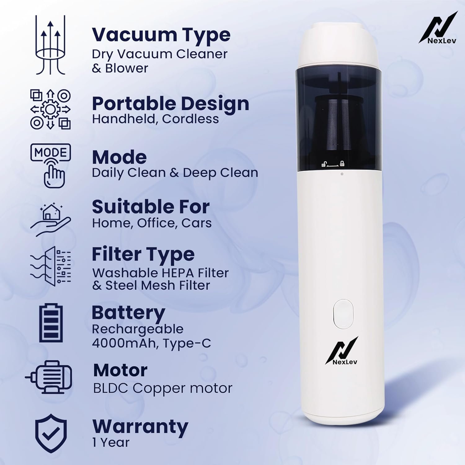 nexlev Cordless Vacuum Cleaner & Blower |BLDC Copper Motor |HEPA with Stainless Steel Cover | for Home Office & Car Cleaning|4 Attachments | Blower for Dust & Inflatables | Portable & Compact | VC-04