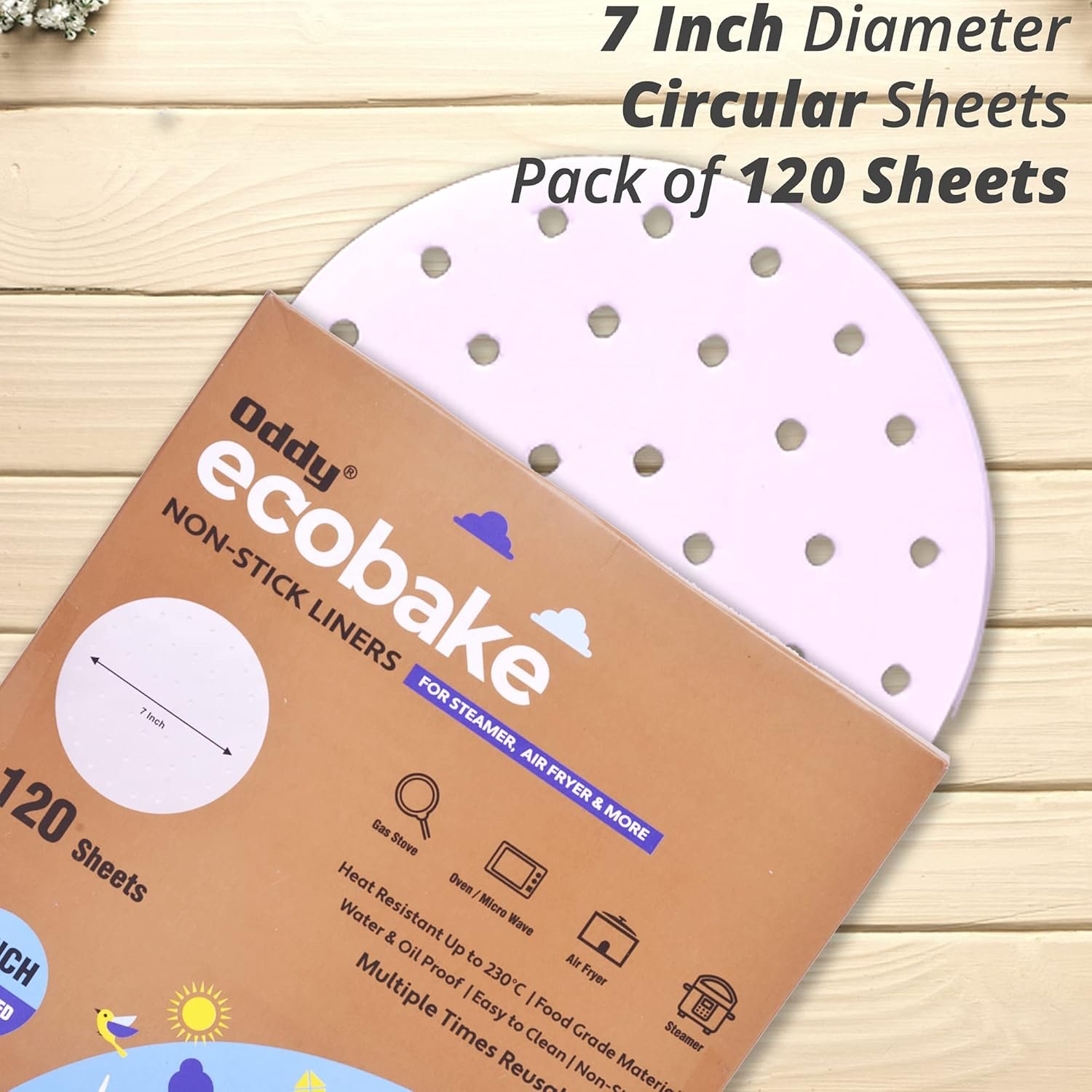 Oddy Uniwraps Ecobake Non-Stick Baking Paper for Steamer,Airfryer&More-Perforated,7 Inch Circle,120 Pcs,White,190 mm