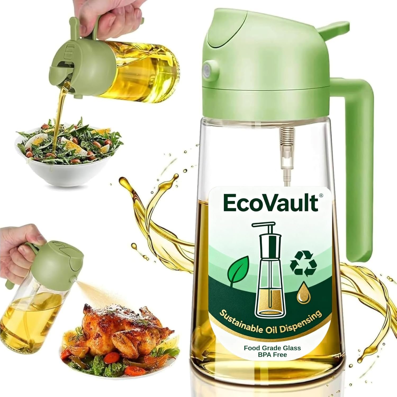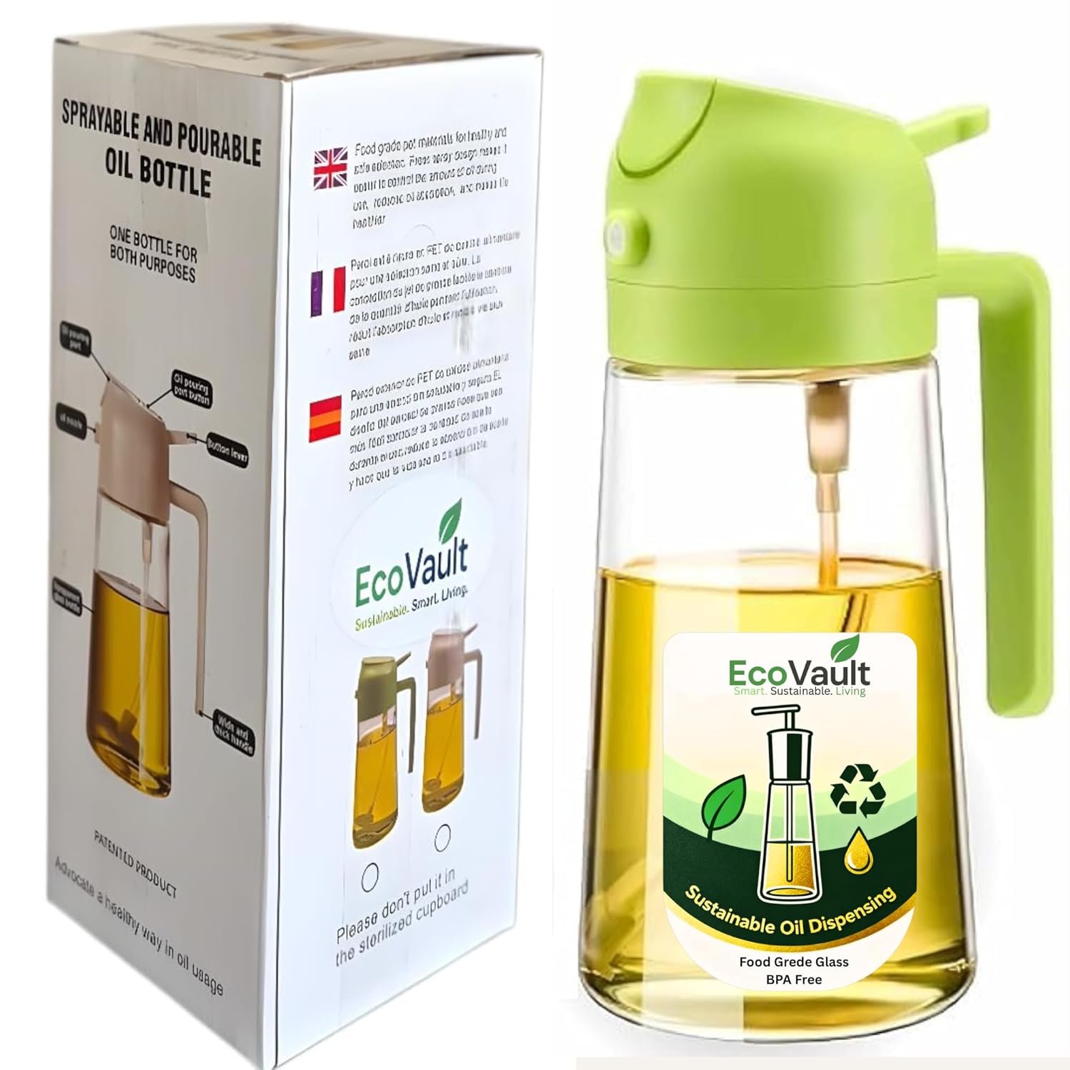 EcoVault 500 ml Glass Oil Sprayer for Cooking (Green) | 2-in-1 Oil Dispenser with Stickers Upgrade your kitchen with the EcoVault 500 ml Glass Oil Sprayer — a smart and sustainable solution for everyday cooking. Designed with a 2-in-1 dispensing system, this premium spray bottle lets you switch between a fine mist spray and a steady stream, giving you perfect portion control for salads, frying, grilling, or BBQ. Crafted from high-quality food-grade glass, the sprayer is not only safe and durable but also easy to clean and refill. The eco-friendly design helps reduce oil waste and ensures healthier cooking with less mess. Its ergonomic grip and non-slip design make handling comfortable, while the 500 ml capacity means fewer refills during busy kitchen sessions. The EcoVault sprayer also comes with customizable oil stickers, so you can neatly label and organize your oils—whether it’s olive oil, sunflower oil, vinegar, or soy sauce. A splash of green on the lid adds freshness, making it a stylish fit for modern kitchen counters.