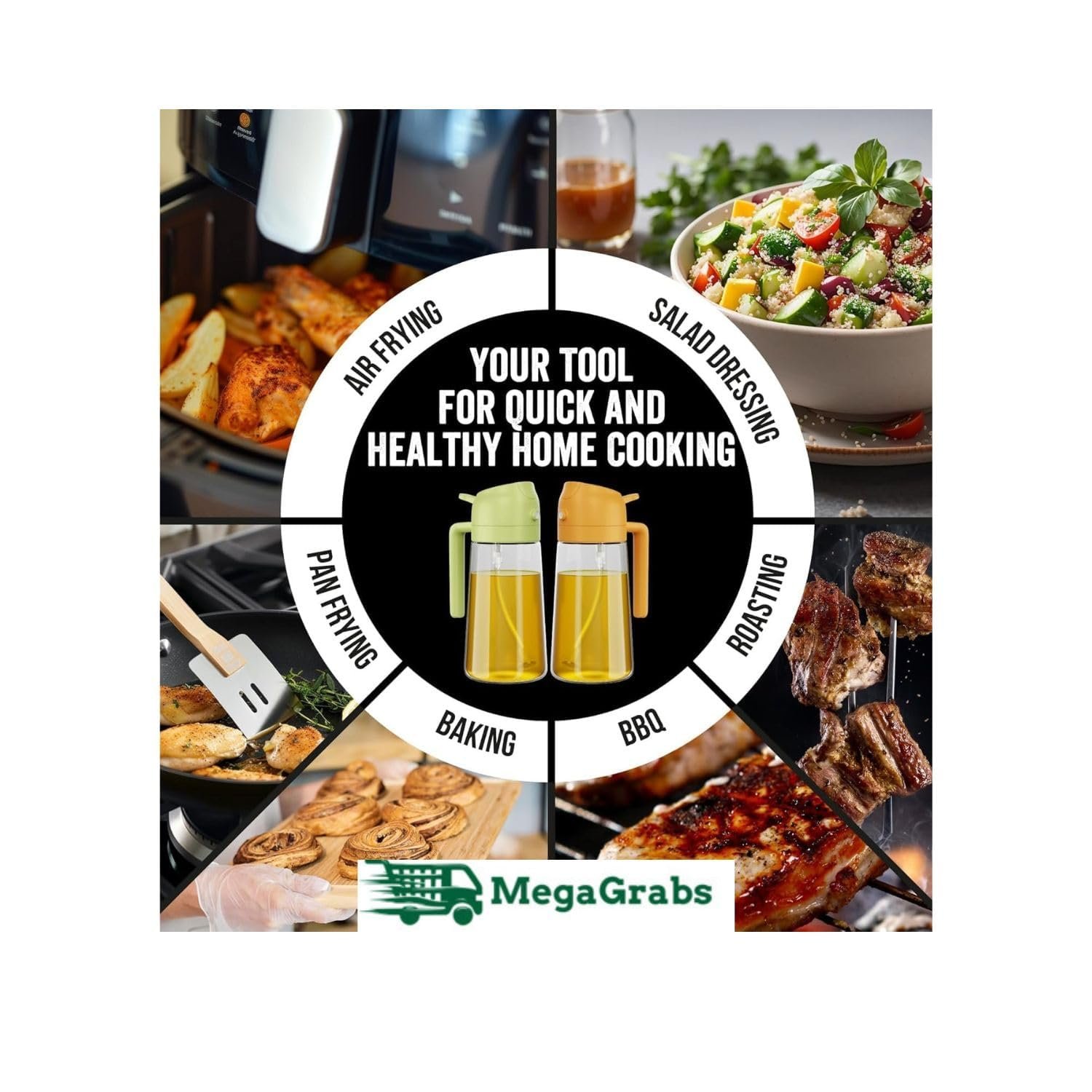 【2-in-1 Oil Dispenser & Sprayer (470ml)】 – Switch effortlessly between spraying and pouring with a single bottle. Ideal for olive oil, vinegar, and more—perfect for air frying, roasting, salads, dosa, and grilling.