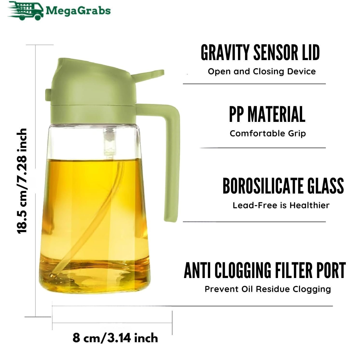 Experience the convenience of this stylish oil dispenser that adds a touch of elegance to your kitchen countertop. Crafted with a durable glass body and a sleek green silicone lid, this dispenser allows you to easily pour your favourite cooking oils without any mess. The transparent design lets you monitor oil levels at a glance, while the non-slip base ensures stability. With a generous 500ml capacity, it’s perfect for everyday use. Elevate your culinary experience with this practical and aesthetically pleasing oil dispenser. Hand-wash recommended for long-lasting use.