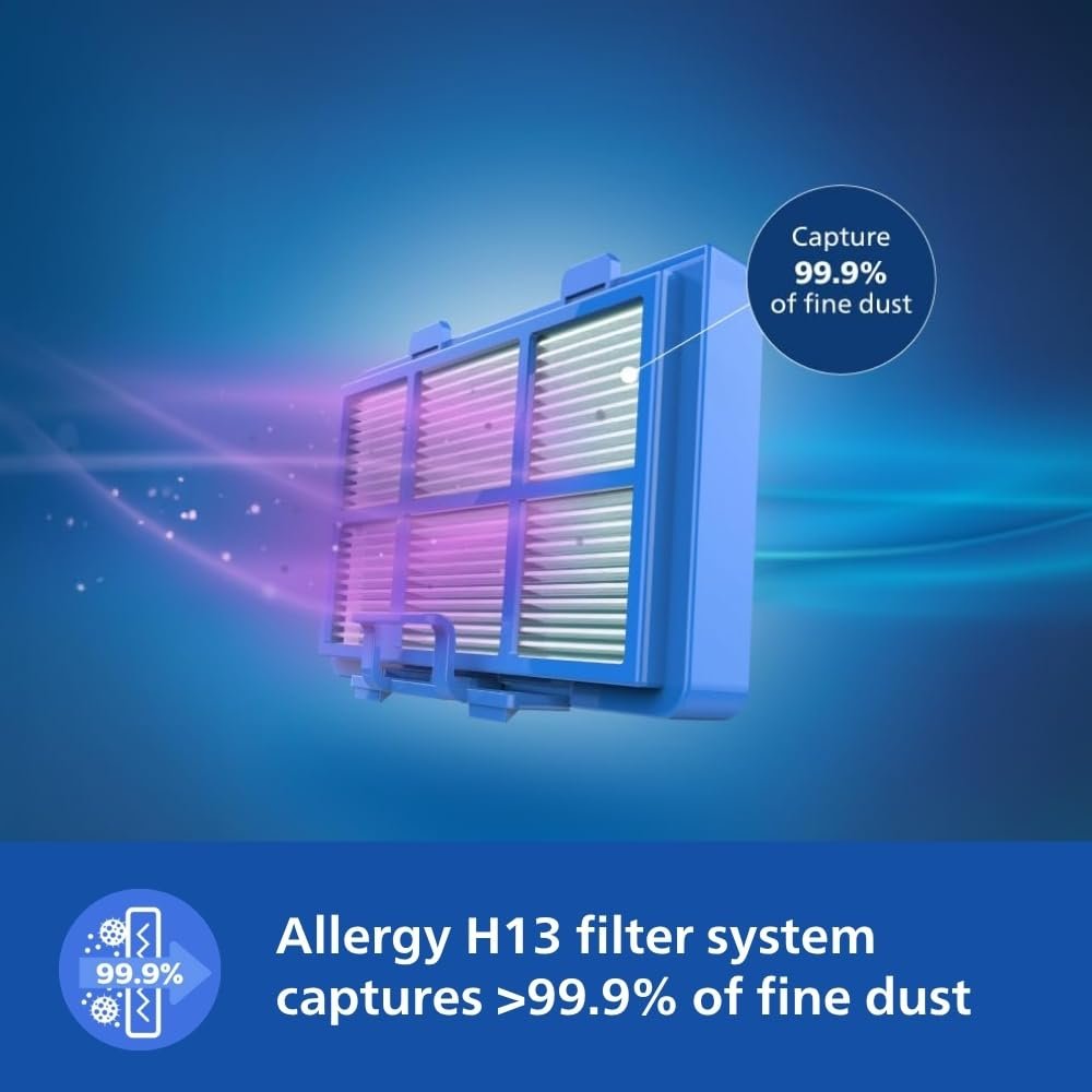 ALLERGY H13 FILTER: The fully-sealed filtration system captures >99.9% of fine dust particles – including pollen, pet hair and dust mites – for allergy sufferers and anyone demanding a higher level of hygiene