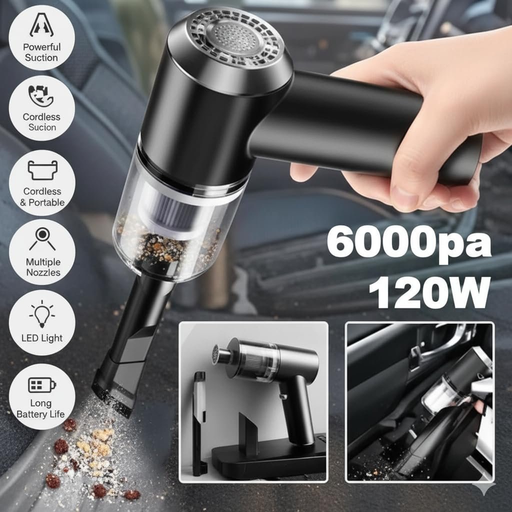 Experience superior cleaning power with this versatile 3-in-1 portable vacuum cleaner. Boasting powerful 6000Pa suction and 120W motor, this handheld device efficiently tackles dirt and debris in your car and home. The innovative blower function adds extra versatility to your cleaning routine. With its USB rechargeable design and impressive 40-minute battery life, you can clean without being tethered to a power source. The lightweight, wireless construction makes it perfect for reaching tight spots in your vehicle or quick clean-ups around the house. Ideal for various situations – from regular car maintenance to camping trips – this vacuum cleaner combines convenience with performance. The reusable filter system ensures long-term value while maintaining consistent suction power. Whether you’re tidying up car interiors,leptop, mobile, led, bed, deep point cleaning home spaces, or managing outdoor messes during travel, this portable vacuum cleaner delivers reliable performance in a compact package.