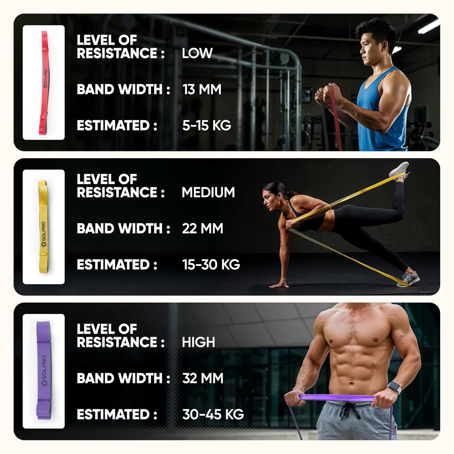 Level of Resistance Red Band: 5–15 KG Yellow Band: 15–30 KG Purple Band: 30–45 KG