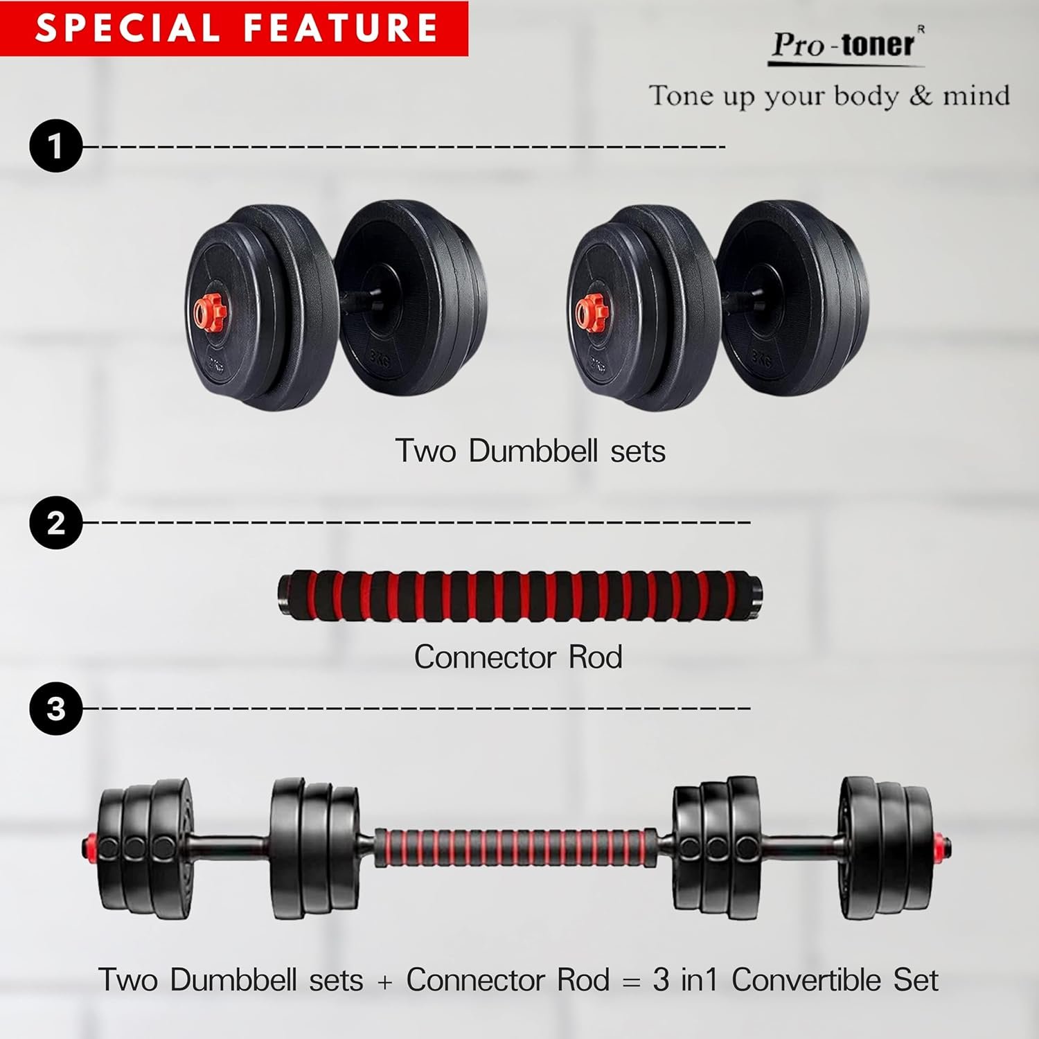 “Fitness Goals Achieved! I’m thoroughly impressed with this Protoner dumbbell set! The 3-in-1 convertible design is perfect for a whole-body workout, and the portable feature makes it easy to store and transport.grip is very nice for hand. Thickness is midium comfortable for hand. Not ichhing and rust resistance for hand. No snad leakage in that dumbbell.Key Highlights:- *Versatile Design*: Adjustable weights allow for various exercises and fitness levels- *Durable Material*: PVC construction ensures long-lasting use- *Space-Saving*: Compact design perfect for home workouts- *Easy to Use*: Simple and convenient to assemble and adjustIdeal For:- *Beginners*: Perfect for those starting their fitness journey- *Home Workouts*: Space-saving design ideal for home gyms- *Fitness Enthusiasts*: Adjustable weights suitable for various exercisesOverall, I’m extremely satisfied with this Protoner dumbbell set and would highly recommend it to anyone looking for a versatile and convenient fitness solution!¹