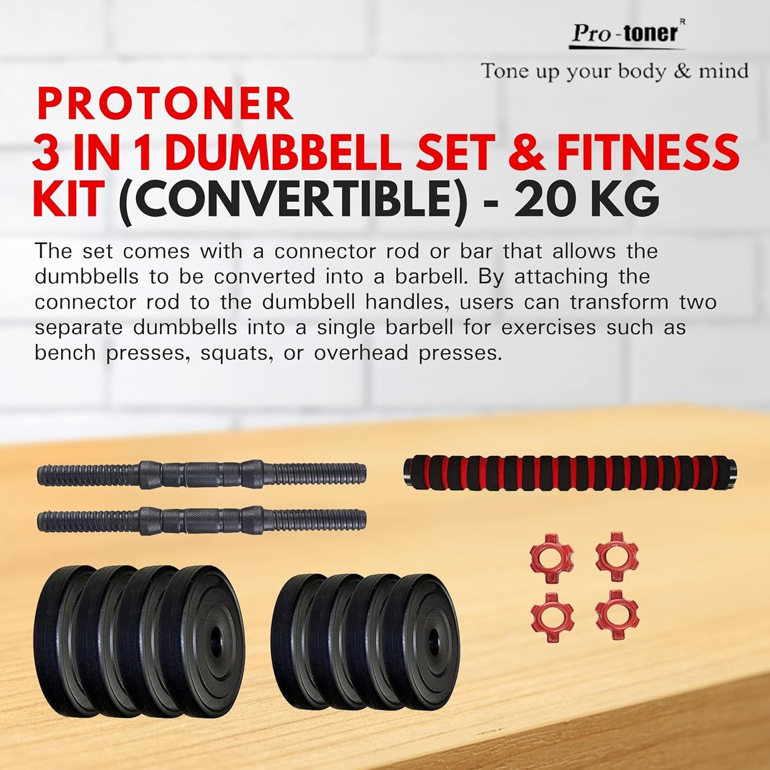 “The body achieves what the mind believes.” Start a workout routine with our Protoner home gym set, specially designed for home use economical,durable and sturdy. DURABLE MATERIAL: Keeping quality in mind, each piece of gym equipment in this kit is made of durable materials to ensure they are long-lasting even after prolonged and vigorous use. ONE FOR ALL:This kit contains gym equipment that can be used both by aspiring beginners or adept professionals. No matter what your fitness level, this kit includes equipment to suit the needs of easy, intermediate and intense workouts. A combination of gym equipment for the perfect workout, Highly durable and long lasting, A perfect muscle builder.