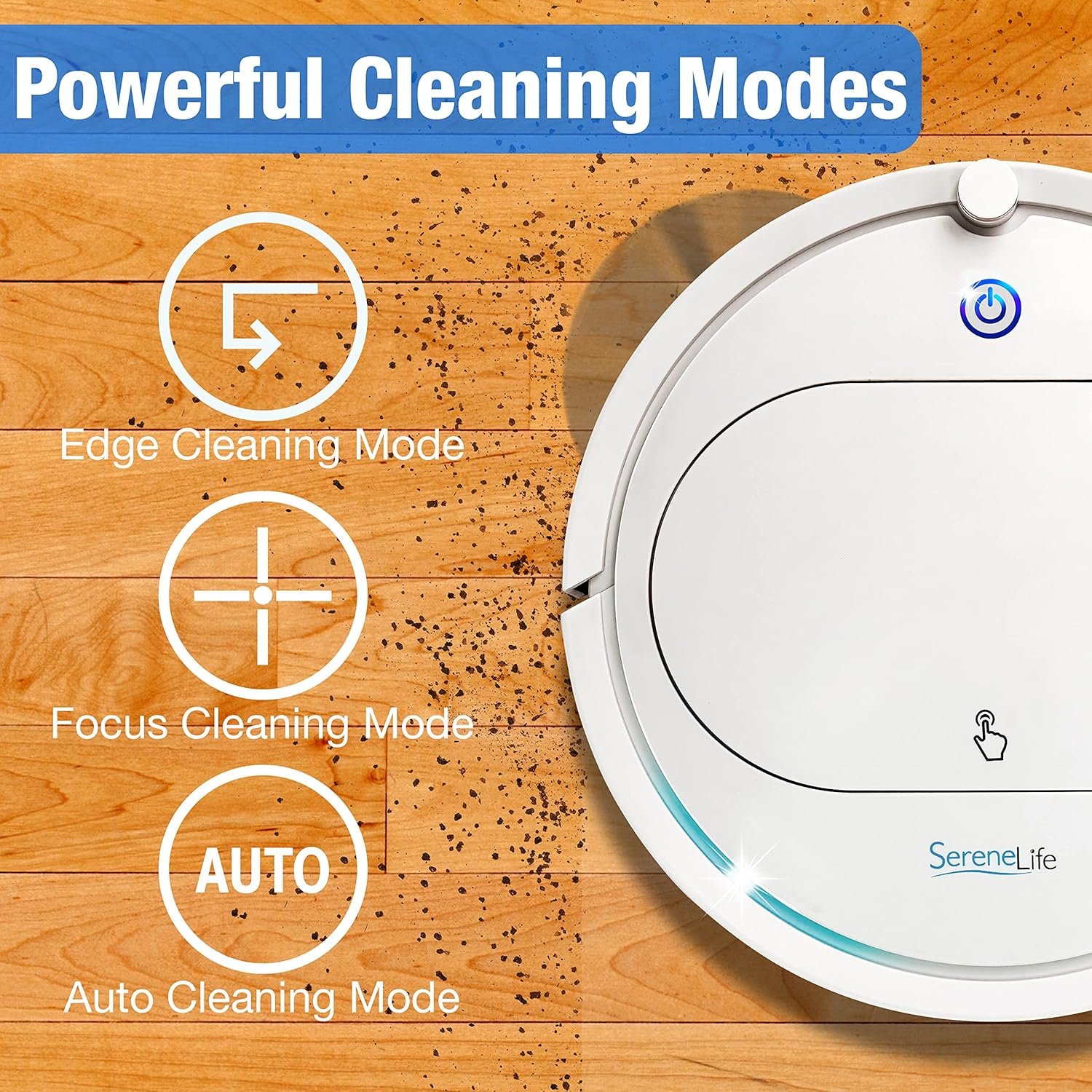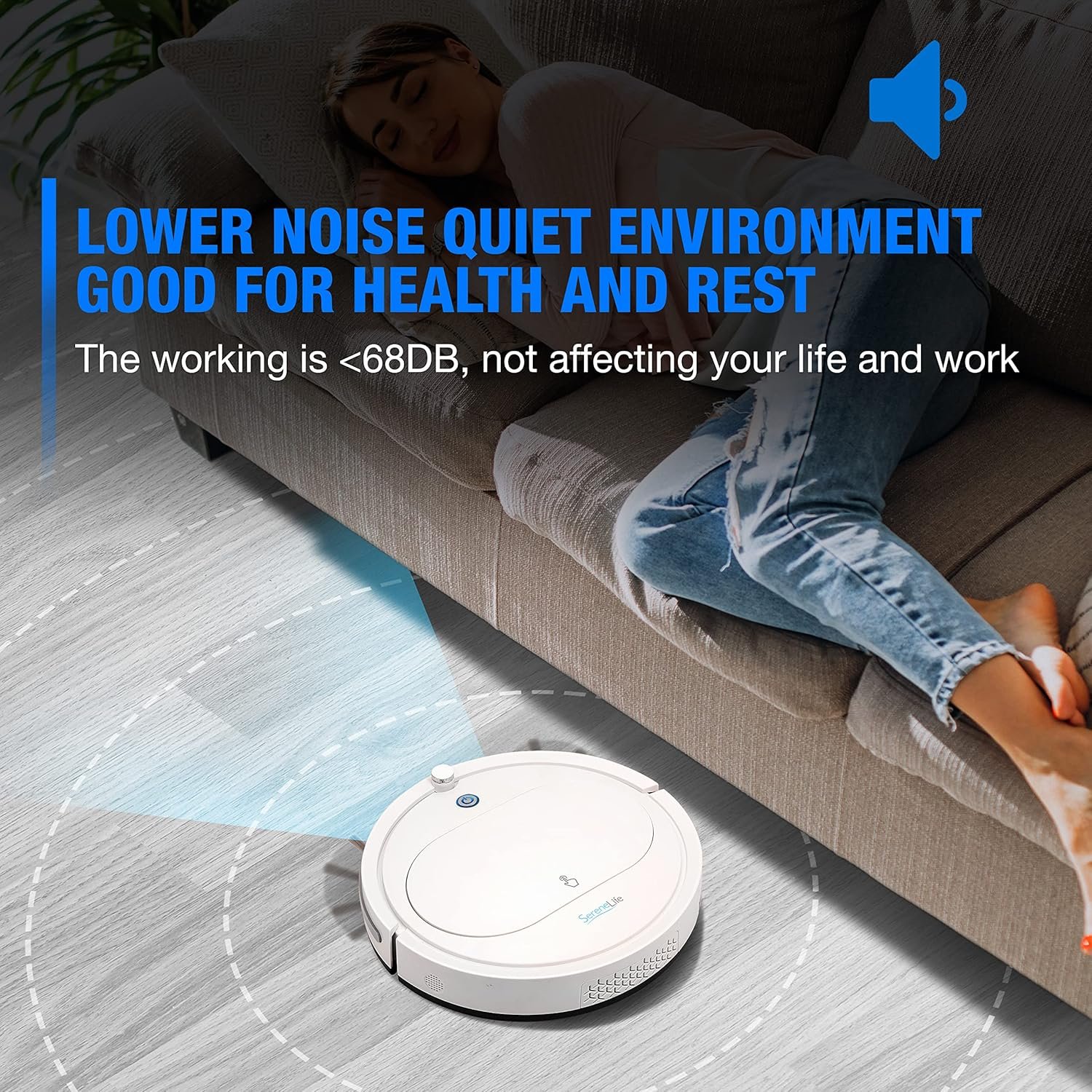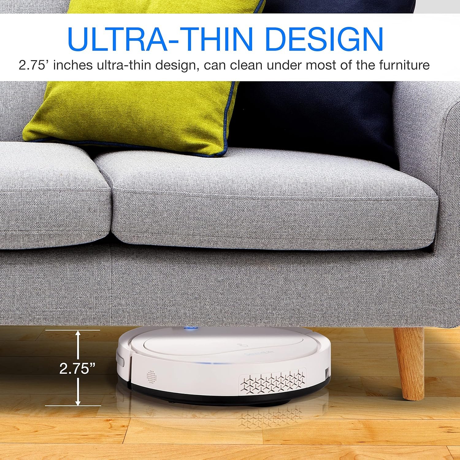 LOW MINI PROFILE The carpets tile hardwood floor robot vacuum slim auto vacuum has 2.75” low profile design to easily fit under the couch sofa or bed. Includes remote control and H10 filters to filter out allergies and keep dust locked away in the bin