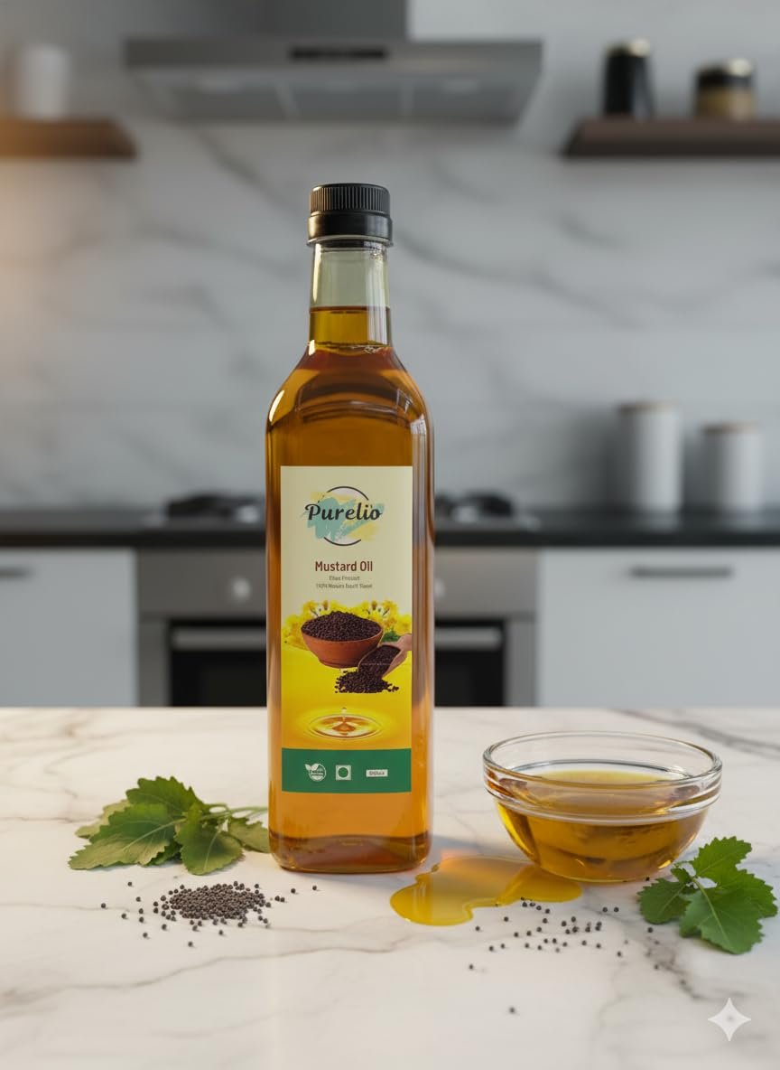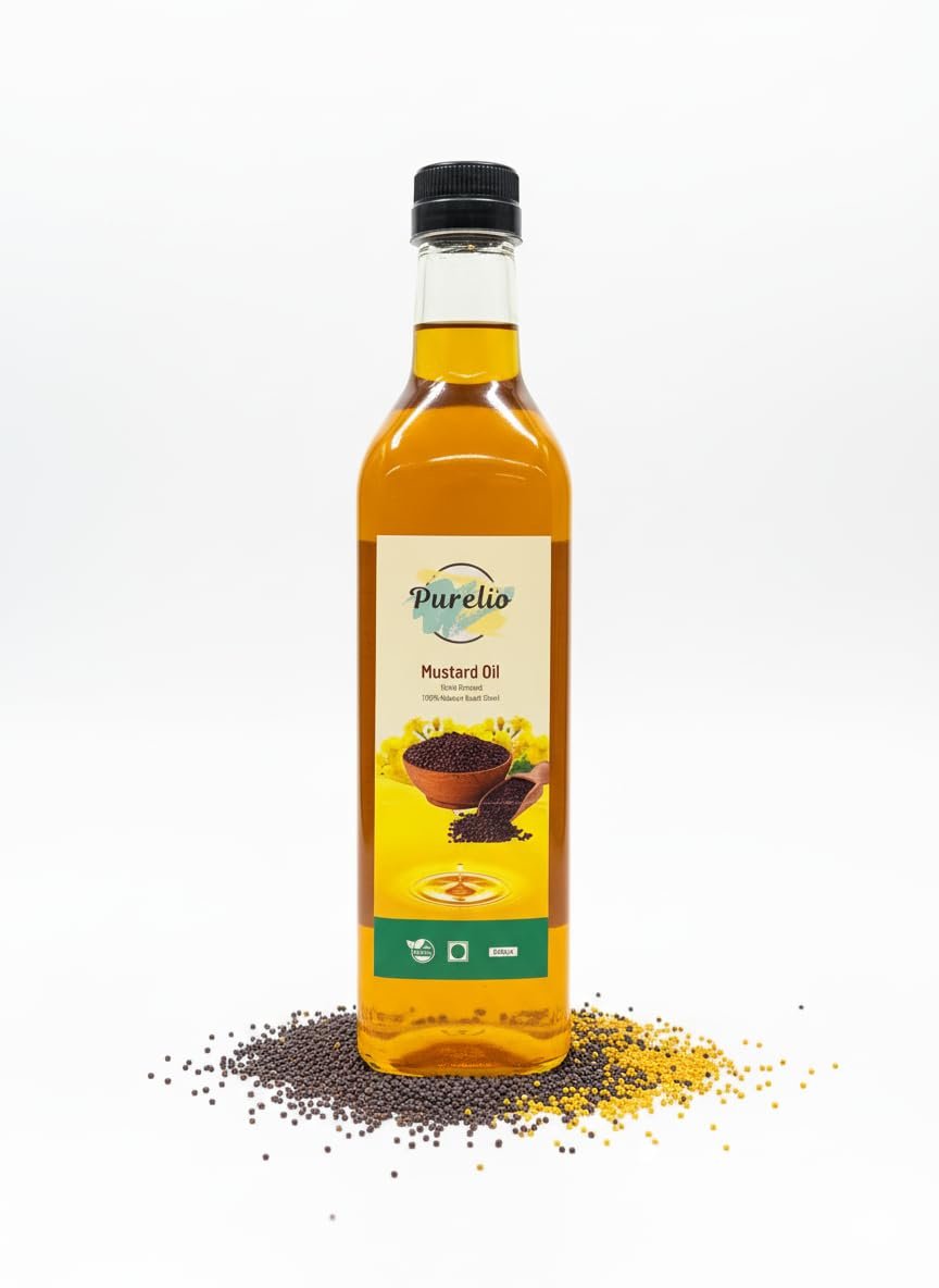 Purelio Mustard Oil 1L | 100% Pure & Natural Cold Pressed Kachi Ghani | Rich in Omega 3 & Vitamin E | High Smoke Point | Ideal for Cooking, Frying, Pickling & Traditional Indian Recipes