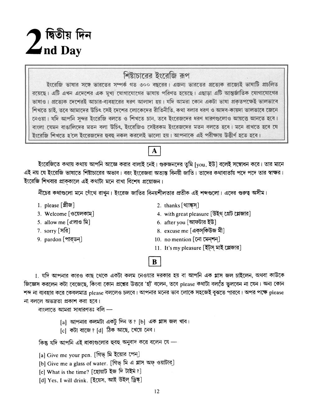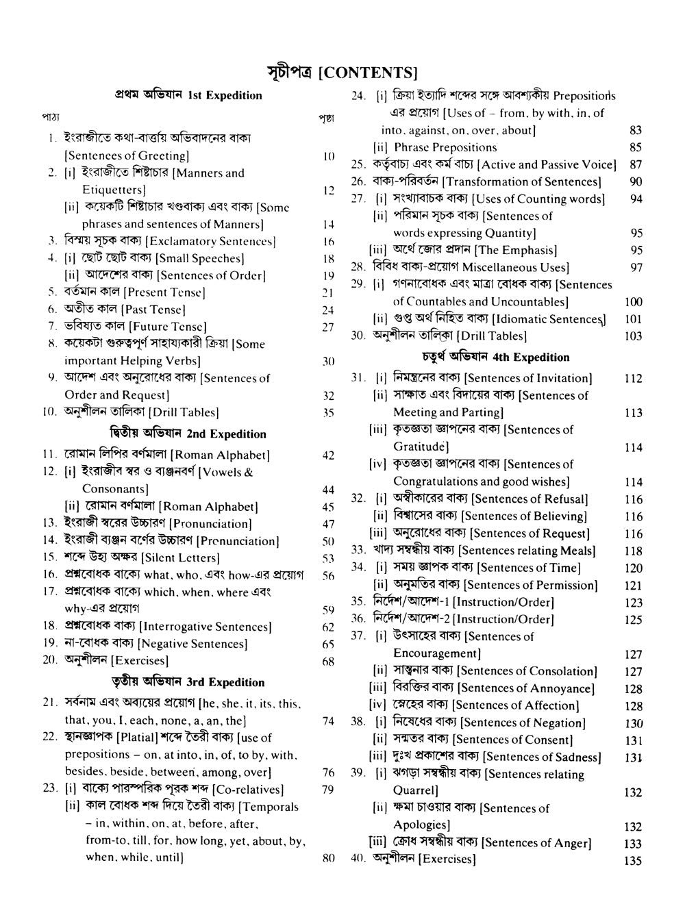 This book contains pages and pages of bengali phrases and their english counterparts. Majority of the translations are acceptable, though more accurate translations exist.The main problem with this book is it tells you the english version of day-to-day bengali sentences so that you can manage a conversation, but it does not do enough to explain why or how this english phrase came about from the bengali one. So, one is more left to the mercy of memory than logic to develop one’s english.I wouldn’t recommend it to a beginner, but to an individual who commands bits and pieces of english and needs to tighten their sentences.