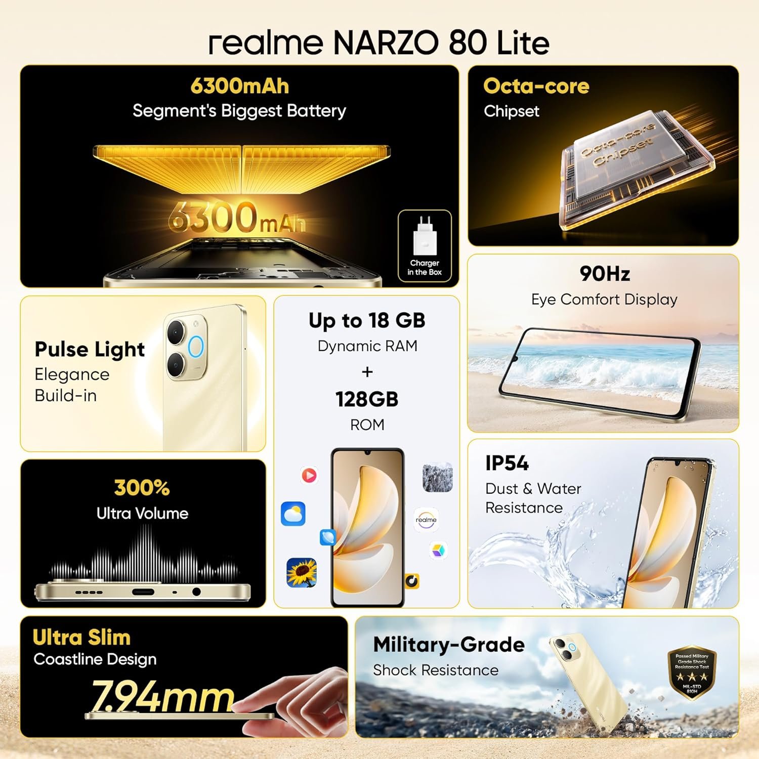 realme NARZO 80 Lite 4G (Beach Gold, 6GB+128GB) | 6300mAh Segment’s Biggest Battery | 7.94mm Slim Design | 300% Ultra Volume | Pulse Light: 9 Colors, 5 Glow Modes | Ai Assist