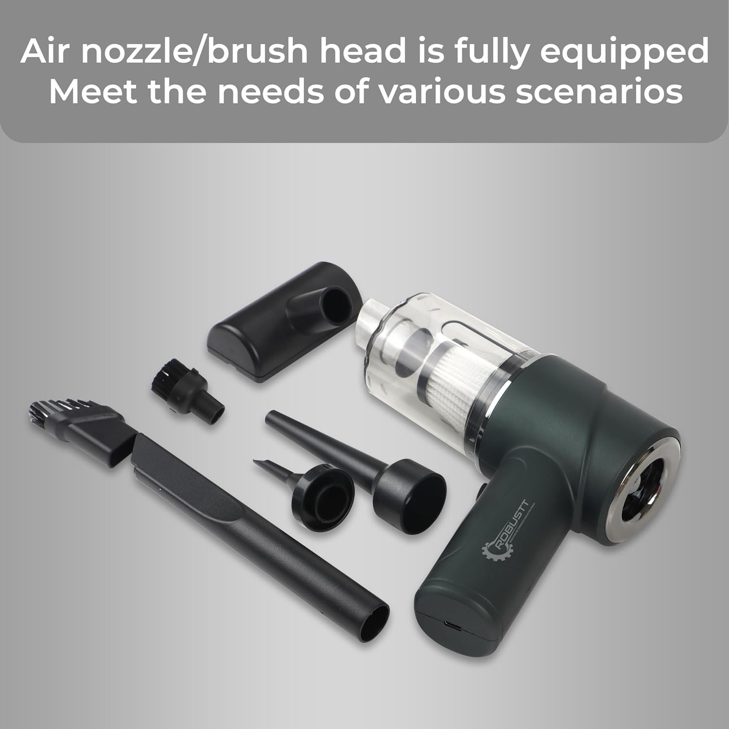 Powerful Battery & Type- C Charging:The Robustt portable car vacuum cleaner comes with Type-C charging and is equipped with a built-in 2000mAH battery. It offers approximately 30 minutes of operating time on a single full charge.
