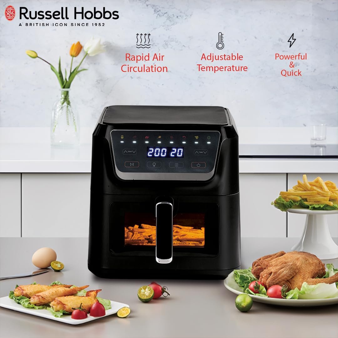 Russell Hobbs Sizzle Air RAF8000 1700W 8L Digital Air Fryer | 8-in-1 Pre-Set Programs | Rapid Air Circulation | Adjustable Temperature (40°C-200°C) | Removable Baking Tray | 2-Year Warranty, Black