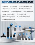 【Packing List】Machine,HEPA filter replacement*1,Storage bag*1,USB charging cable*1,Floor brush*1,Long flat suction*1,Flat suction brush*1,Air extraction nozzle*1,Long blowing pipe*1,Pipe blowing round brush*1,Short blowing nozzle*1,Large inflator nozzle*1,Small inflator nozzle*1,Clean Brush*1
