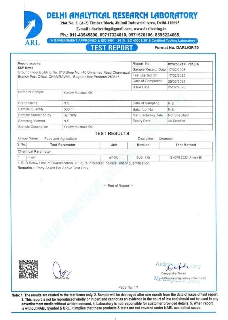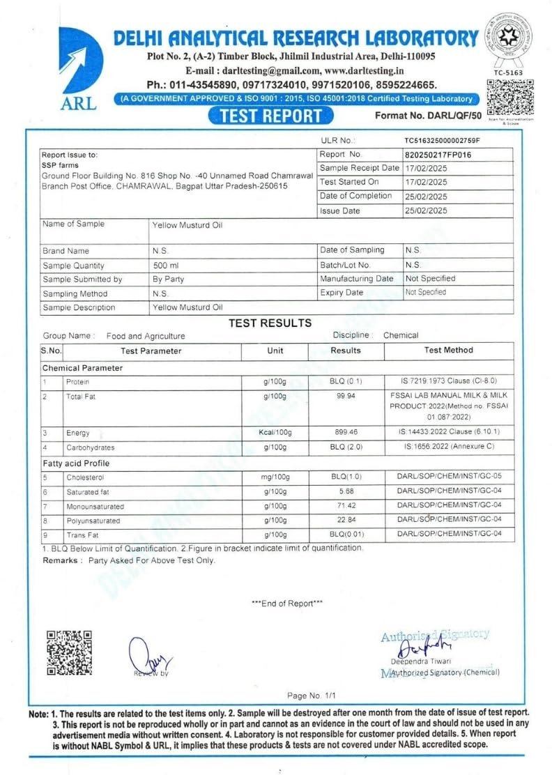 Lab-Tested for Safety & Purity: Every batch of our wood pressed mustard oil undergoes stringent quality checks and is tested across 17+ FSSAI-mandated food safety parameters to ensure the highest level of purity, freshness, and health benefits for your family.