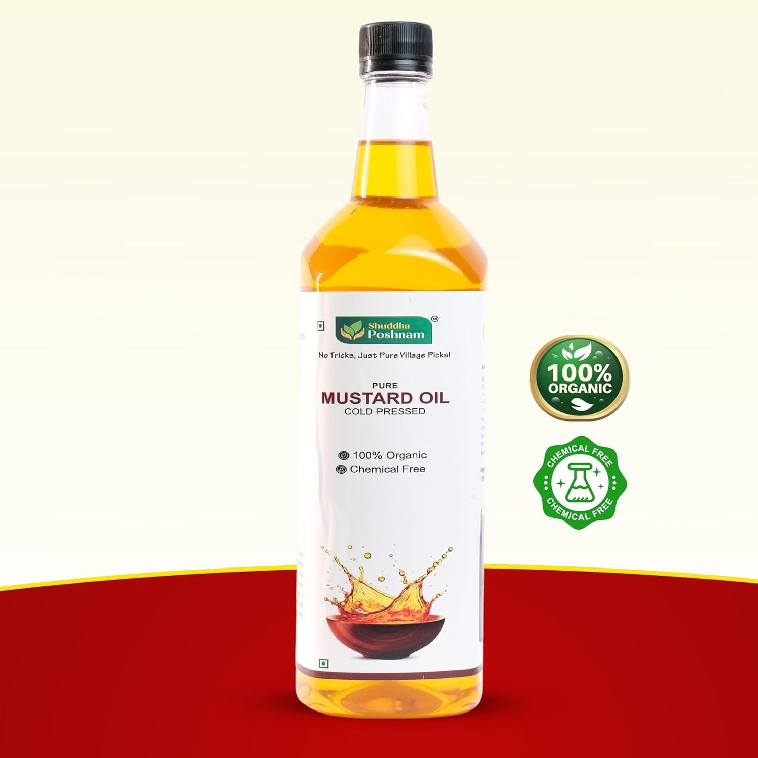 Shuddha Poshnam Cold Pressed Yellow Mustard Oil is extracted using traditional Kacchi Ghani (cold-press) methods in Kolhus at low temperatures to retain its natural aroma, taste, and nutrients. We use native Yellow mustard seeds sourced from Indian farms, which are sun-dried for enhanced flavour before pressing. The oil is then allowed to settle naturally for 2-3 days and filtered gently without chemicals, ensuring an unrefined and unfiltered product that’s as close to nature as possible.Rich in monounsaturated fatty acids, omega-3 & omega-6, this cold pressed mustard oil supports heart health and boosts immunity. With a high smoke point, it’s perfect for Indian cooking — whether you’re sautéing, frying, or tempering. Beyond the kitchen, this organic mustard oil cold pressed is excellent for skincare, haircare, and baby massage, and is ideal for Ayurvedic oil pulling and other wellness rituals. Packed in a premium 1L bottle, this wood pressed mustard oil ensures purity, freshness, and longer shelf life. Lab-tested and FSSAI compliant, it is free from additives or preservatives. Make the switch to this mustard oil cold pressed for a truly wholesome, chemical-free lifestyle — pure, potent, and proudly made in India.