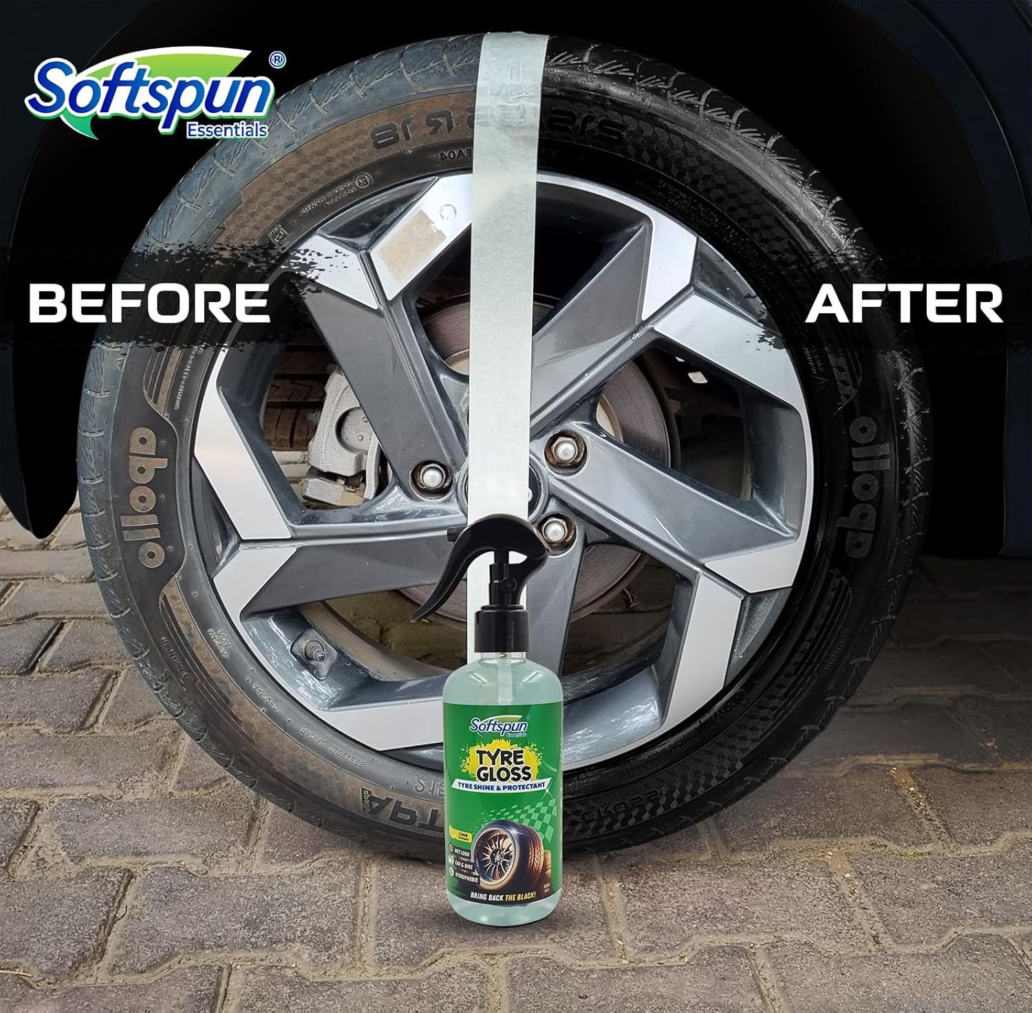 Hello everyone! 👋 I was looking for a tyre polish that actually lasts, and I grabbed the SOFTSPUN Essentials Tyre Gloss (300ml) combo (it comes with a handy applicator pad!). After using it twice on my bike tyres, here’s my honest take.Application & ShineEasy to Use: The spray bottle and the included applicator pad make the process super easy. Just spray a bit on the pad, wipe it evenly on the tyre wall, and you’re done! It takes literally five minutes per vehicle.Wet Look Shine: This is the product’s biggest strength. It delivers a proper deep, glossy, wet-look shine that really makes the black rubber stand out. It makes the vehicle look instantly better, especially after a wash.Hydration & Protection: My old bike tyres were looking a bit dry and grey. This spray definitely seems to hydrate the rubber, giving it a rich black look. The UV protection is an added bonus for our harsh sun!.The Durability Test (Water Repellent):I was impressed that it’s quite water-repellent. Even after driving through some splashes and light rain, the shine didn’t immediately wash off. It fades slowly over several days, but it definitely lasts longer than cheaper sprays I’ve tried.One Small Point to Note:The only thing to be careful about is the application amount. If you spray too much gloss and don’t wipe it evenly, it can lead to some minor residue splatter on your body panels when you first drive. Use it sparingly on the pad and wipe well for the best results!.Should You Buy?If you want professional, long-lasting high gloss for your tyres, this is a must-buy. It’s effective, protects the rubber, and the value for money is excellent given the professional shine it delivers. Highly recommended for all car and bike enthusiasts!.