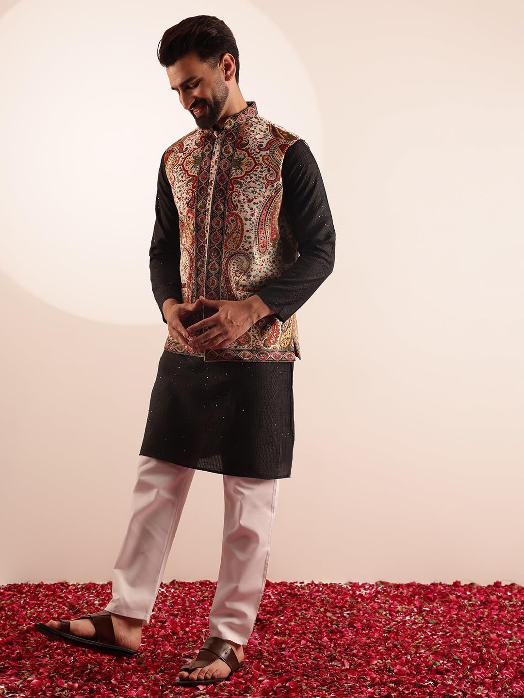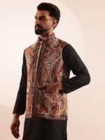 SOJANYA Men’s Silk Blend Black Kurta & White Pyjama With Velvet Paisley Design Nehru Jacket