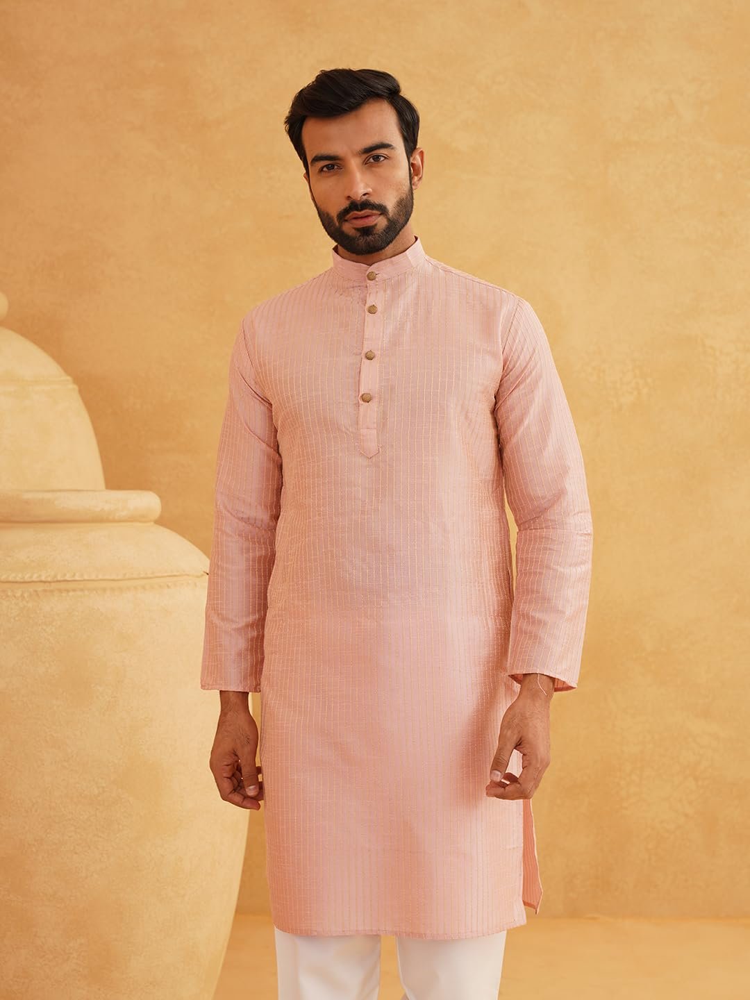 This is an amazing kurta. It is pink in color – although it doesn’t show because of the light effect.It is 80% silk and it glows when the light shines on it. It is pretty comfortable to wear, but if you feel that it is itchy, you can wear a tight white t-shirt on the inside. That will protect the kurta as well.They recommend hand washing the kurta but if you want to preserve the shine, it is better to dry clean it just to be on the safe side.At $57, this is a pretty reasonable priced kurta as well. I recommend this product!