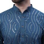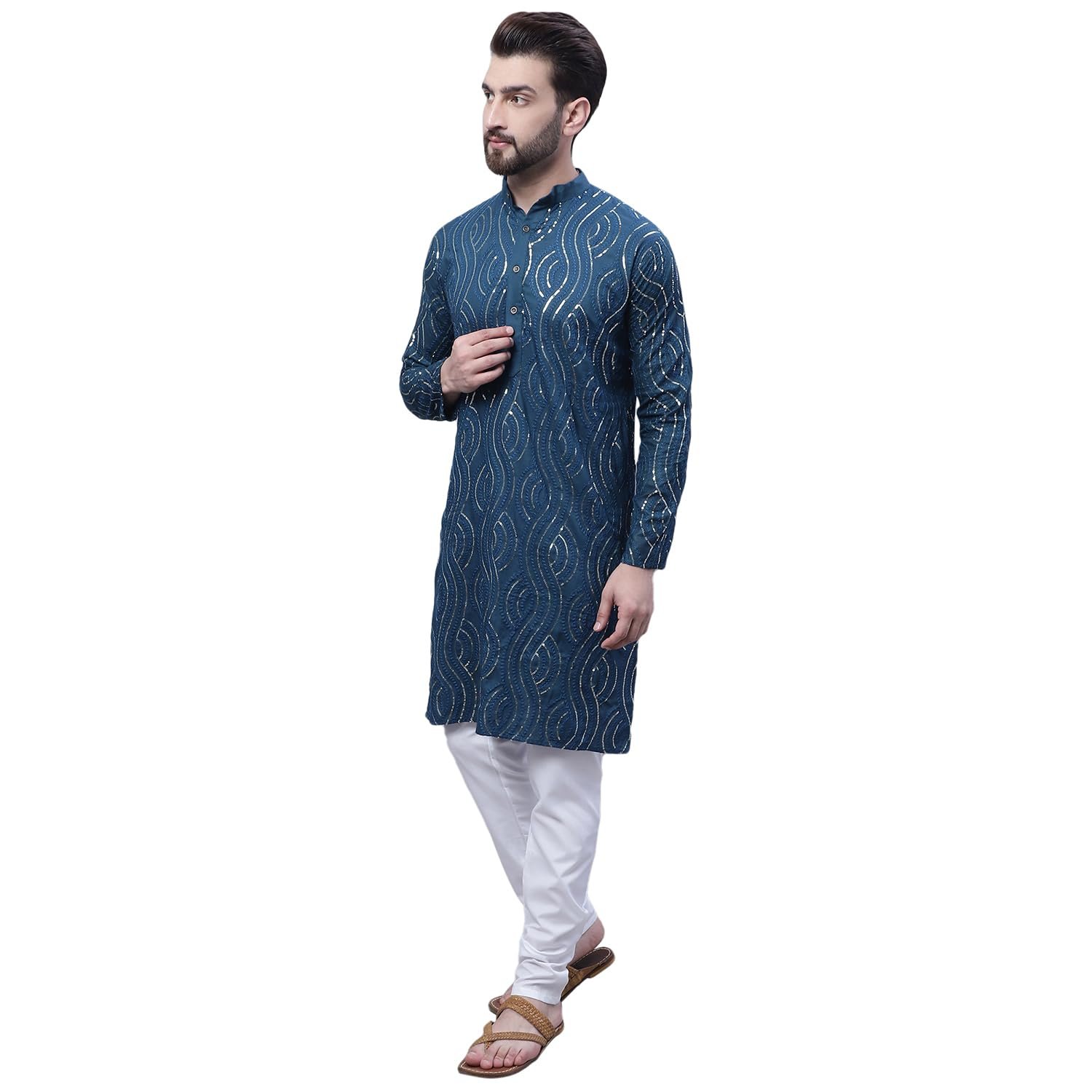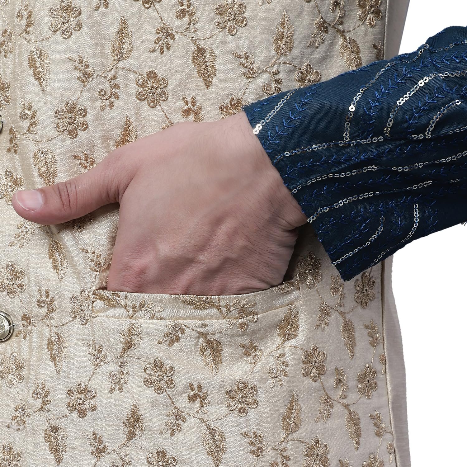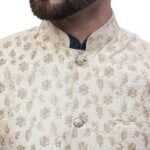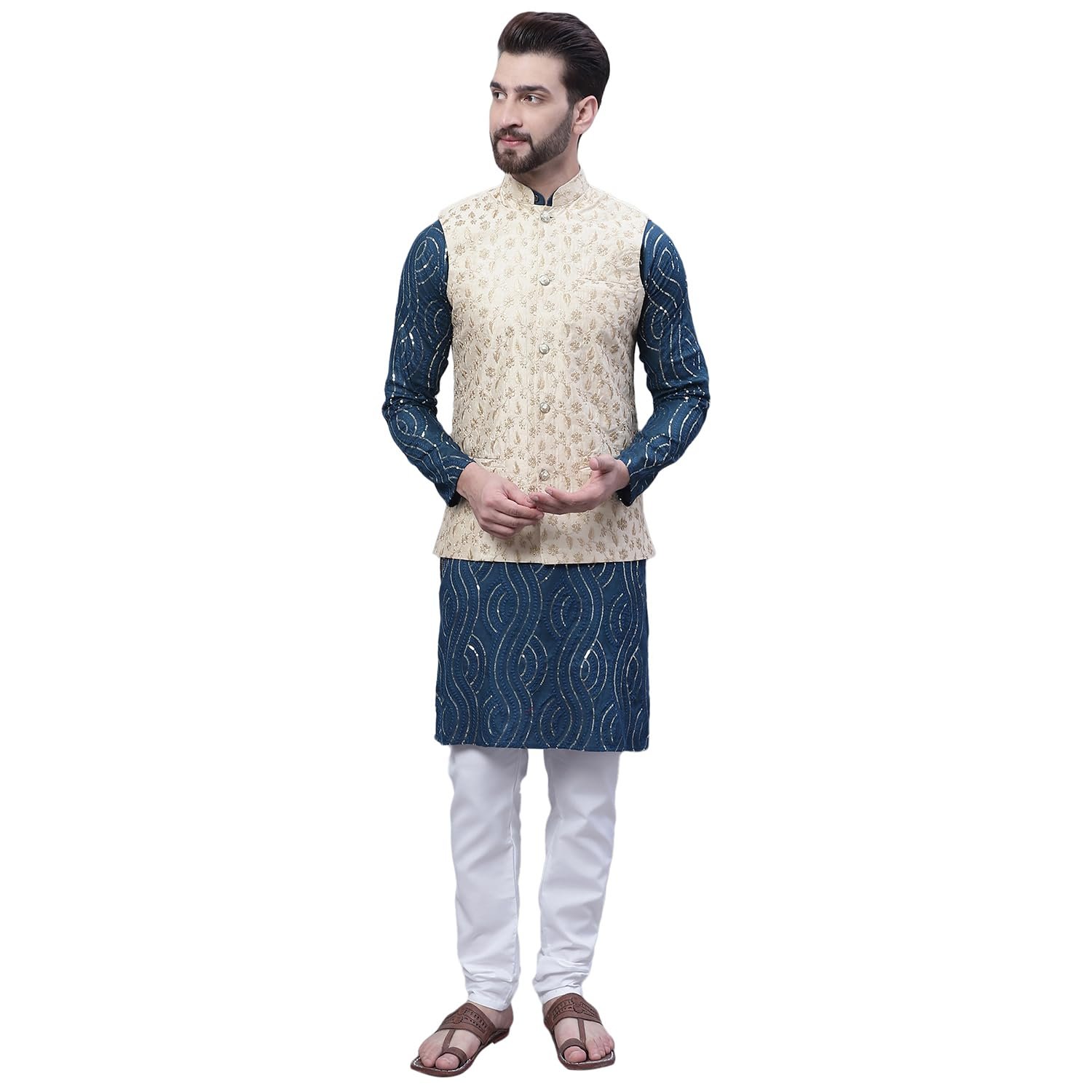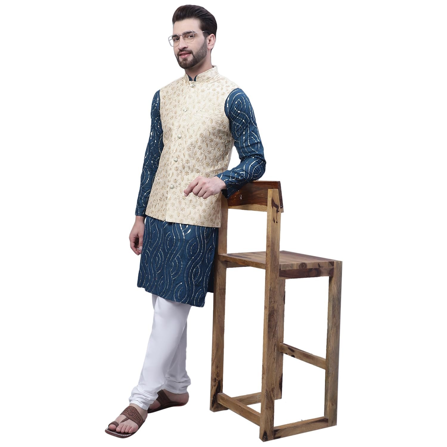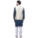 SOJANYA (Since 1958 Men’s Pure Cotton Teal Blue Kurta and White Pyjama with Beige Embroidery Nehru Jacket