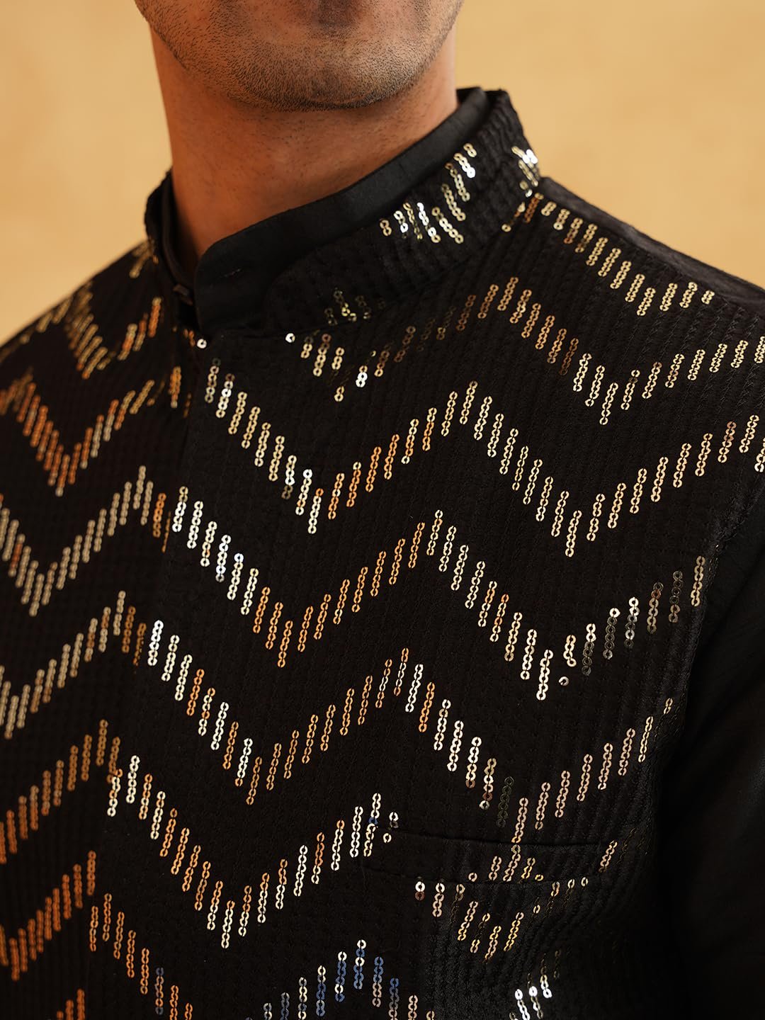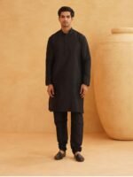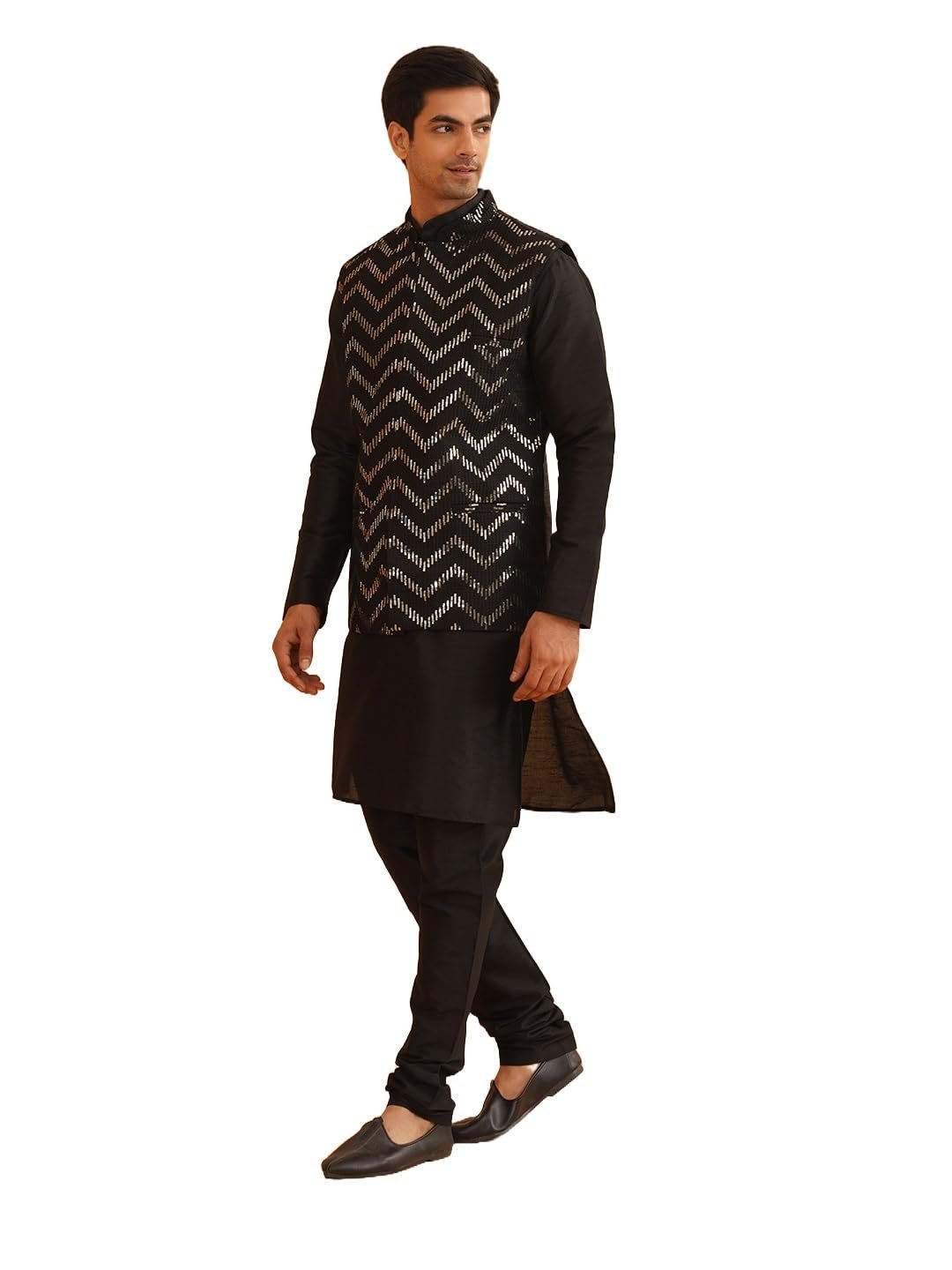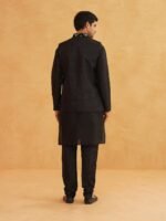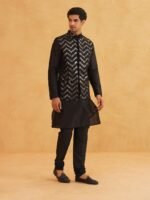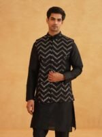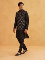 SOJANYA (Since 1958 Men’s Silk Blend Black Kurta Pyjama With Black Zigzag Nehru Jacket