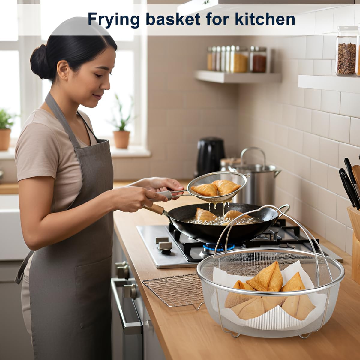 High-Quality Stainless Steel Construction: Crafted from premium food-grade stainless steel, this mesh fry basket is rust-proof, corrosion-resistant, and built for long-term use the strong wire frame maintains its shape even with frequent frying and washing.