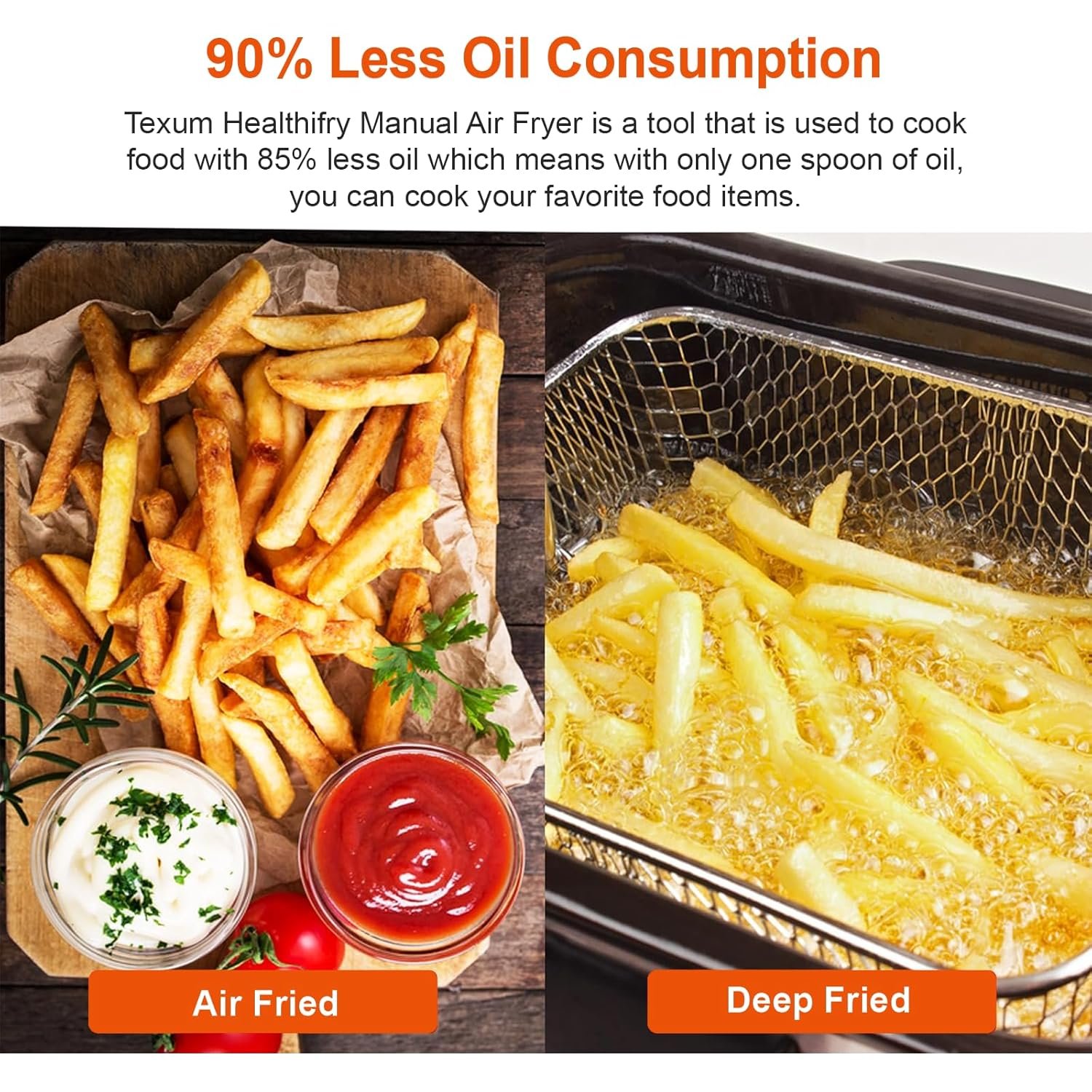 Texum TAF-HK10 Air Fryer With the 2.5-liter, cooking healthy meals will be simple. You can bake, grill, and roast your favorite foods with up to 85% less fat when you use this versatile kitchen technology, which combines 800 watts of power with quick air circulation technology. Its compact size makes it perfect for any kitchen, providing delicious, speedy meals for both people and small families. This dishwasher-safe, non-stick basket, easy-to-use control panel, and adjustable temperature settings make cooking and cleaning with the Texum Air Fryer a breeze. Take pleasure in cooking that is safe and energy-efficient because of the automatic shut-off feature and cool-touch handle.