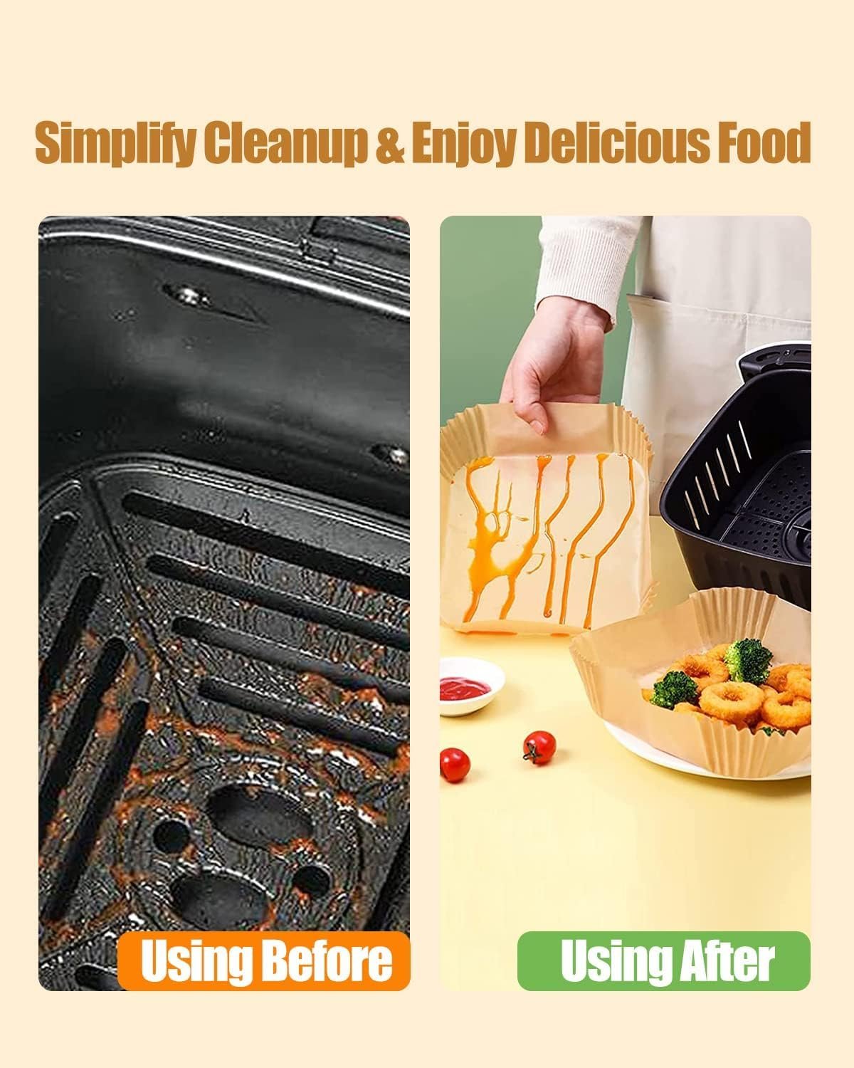 【Keep Air Fryer Clean】 :Air fryer disposable paper liners keep the fryer as clean as it was before use, preventing food scraps and greasy stains from being left on the cookware. Extend fryer life and reduce cleaning time. The best air fryer accessories. These disposable paper liners can effectively keep food residue away from the fryer and make it as clean as unused, saving time and effort. These paper liners are a must-have if you hate cleaning after baking.