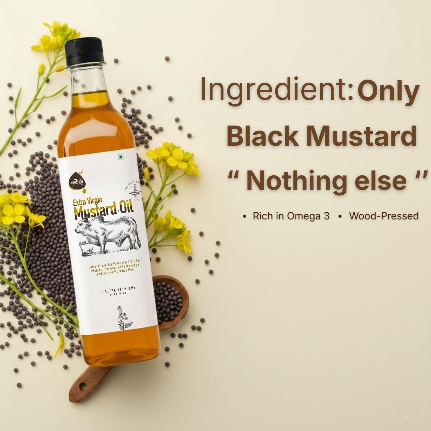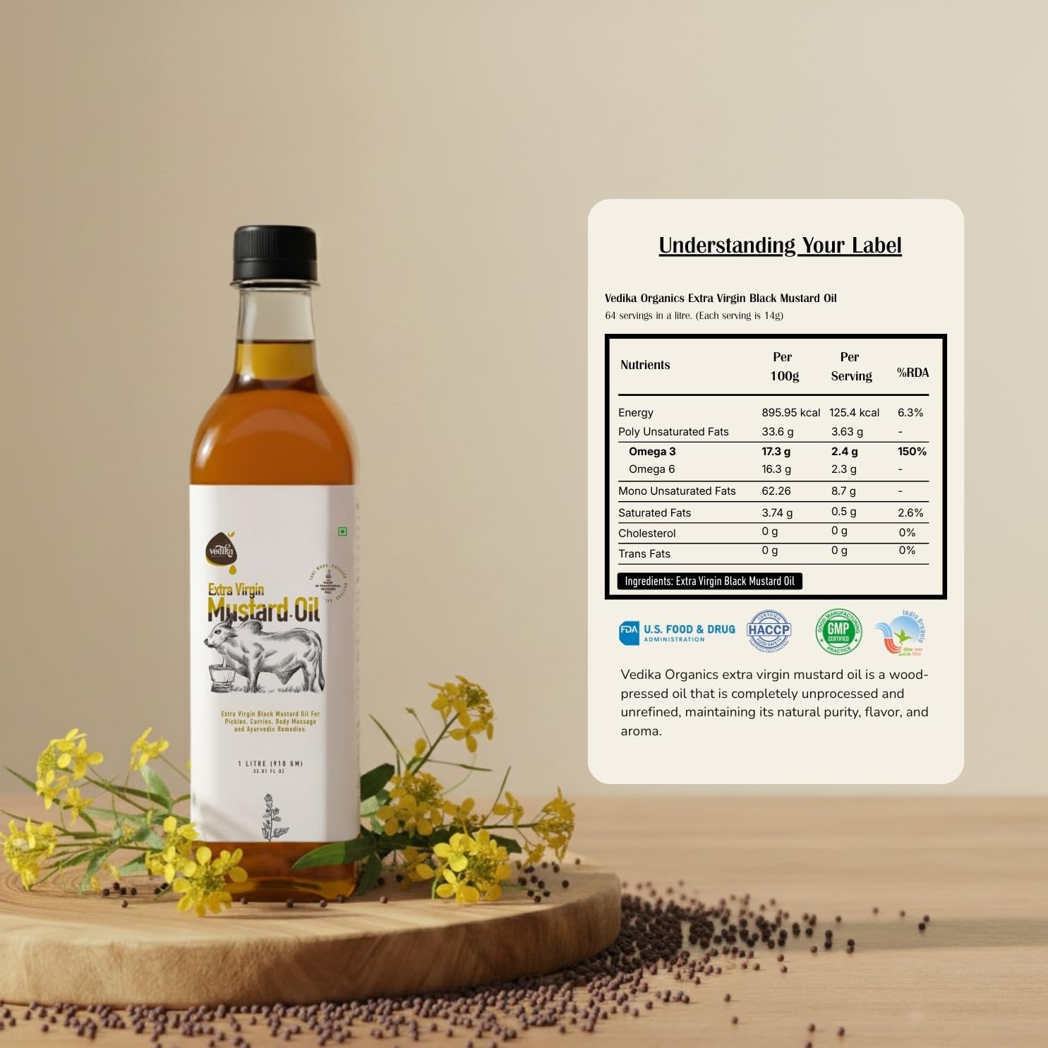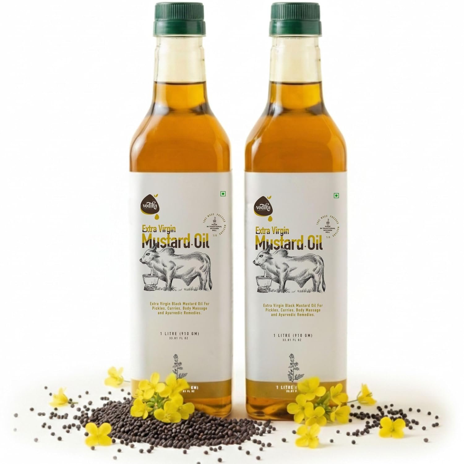 Vedika Organics Extra Virgin Mustard | Wood Pressed Kacchi Ghani Virgin Sarson Oil | 100% Unrefined, Organic, Edible Cooking & Massage Oil for Hair, Skin & Pickles (1liter (Pack of 2))