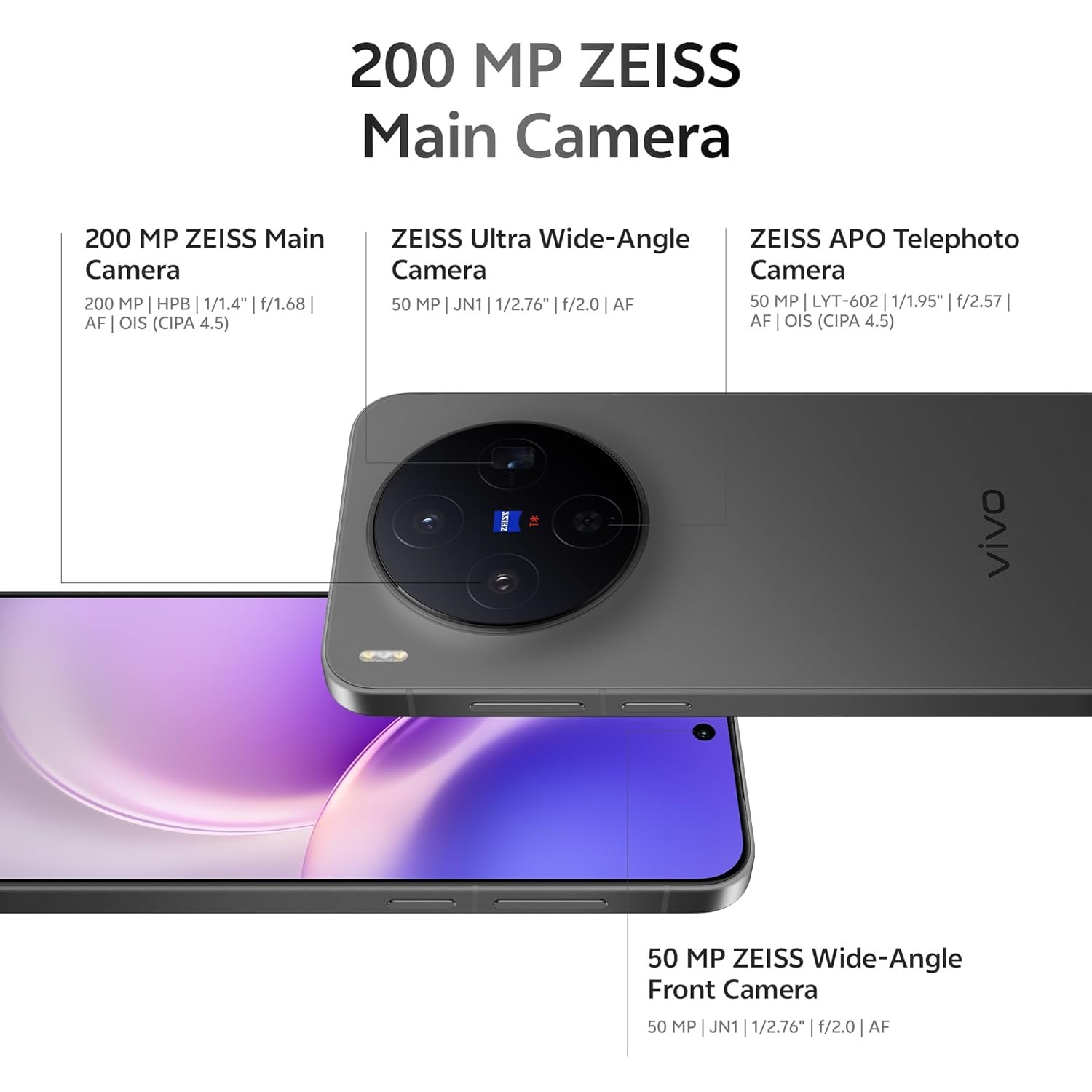 [Main Camera]: 200MP ZEISS Super Main Camera (HPB customized sensor) | 1/1.4″ sensor | f/1.68 | OIS | 16-in-1 pixel binning for better low-light | ZEISS T* coating + Super Blue Glass | Optical Precision Calibration for edge-to-edge sharpness | 50MP Ultra-Wide Camera | JN1 sensor | f/2.0 | Autofocus | 50MP ZEISS Periscope Telephoto Camera | LYT-602 (IMX885) | 1/1.95″ | f/2.57 | Periscope design | Up to 20× telephoto macro | 11.9% better sensitivity vs IMX882 (SNR10) | VCS color accuracy improvement | Front Camera – 50MP ZEISS Ultra-Wide Camera | 92° FOV | f/2.0 | Autofocus