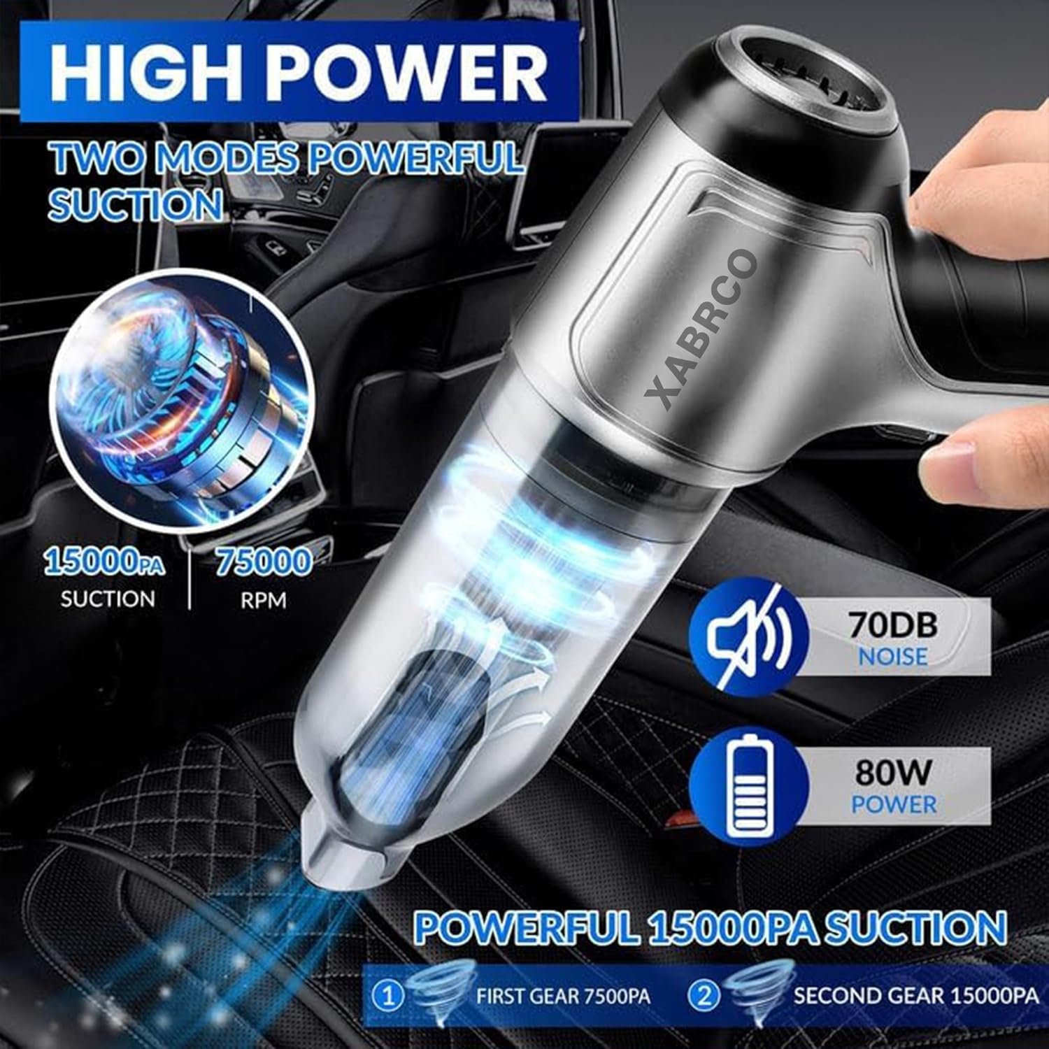 Equipped with a 15000Pa high-performance motor, the XABRCO Handheld Vacuum delivers strong, consistent suction power that removes dust, dirt, pet hair, food crumbs, and even fine debris in seconds.