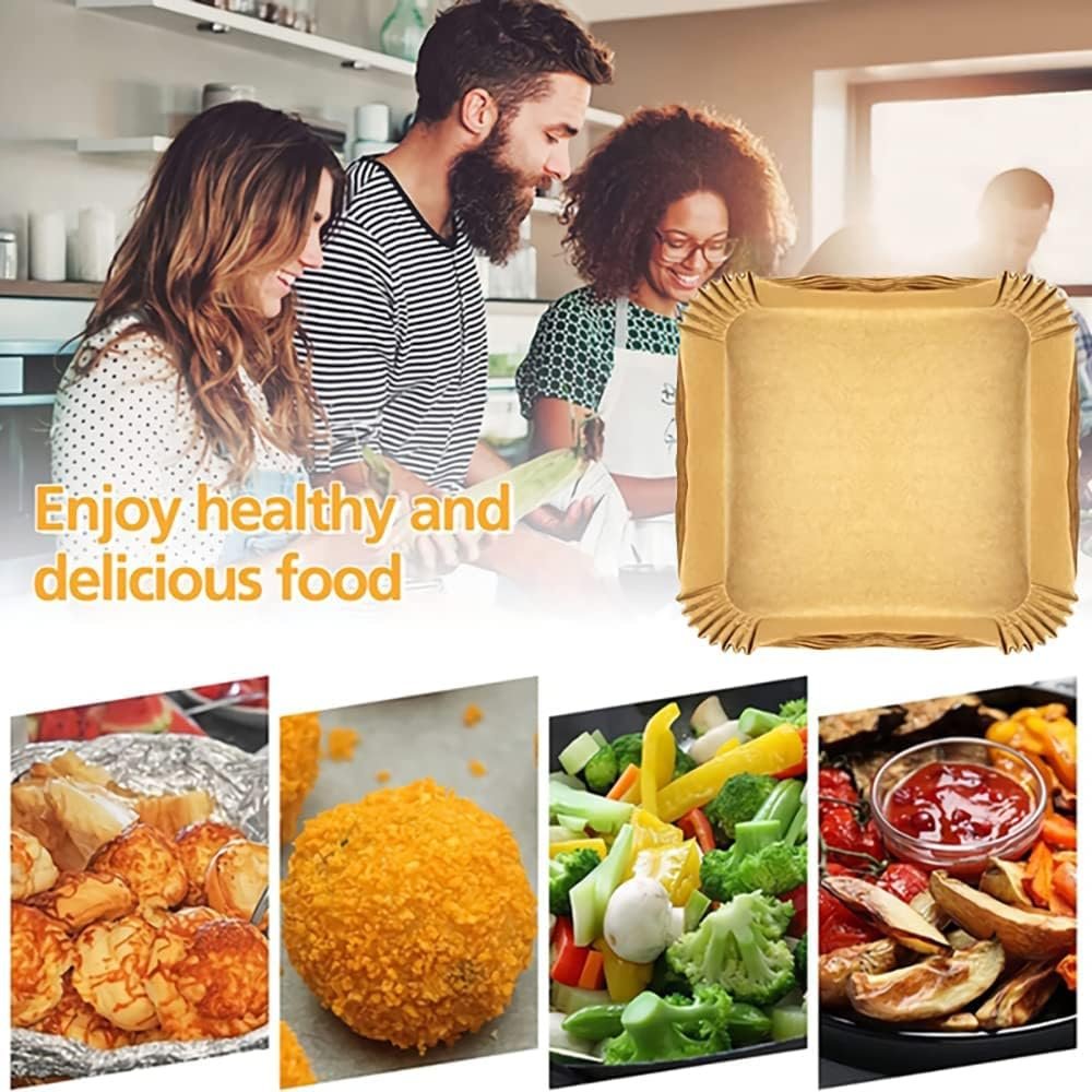 The air fryer paper sheets or air fryer parchment paper liners is made of food-grade parchment paper, which is oil proof, water proof and non-stick. Air fryer paper liners can withstand temperatures up to 428 degrees Fahrenheit and it has no effect on the taste of food.