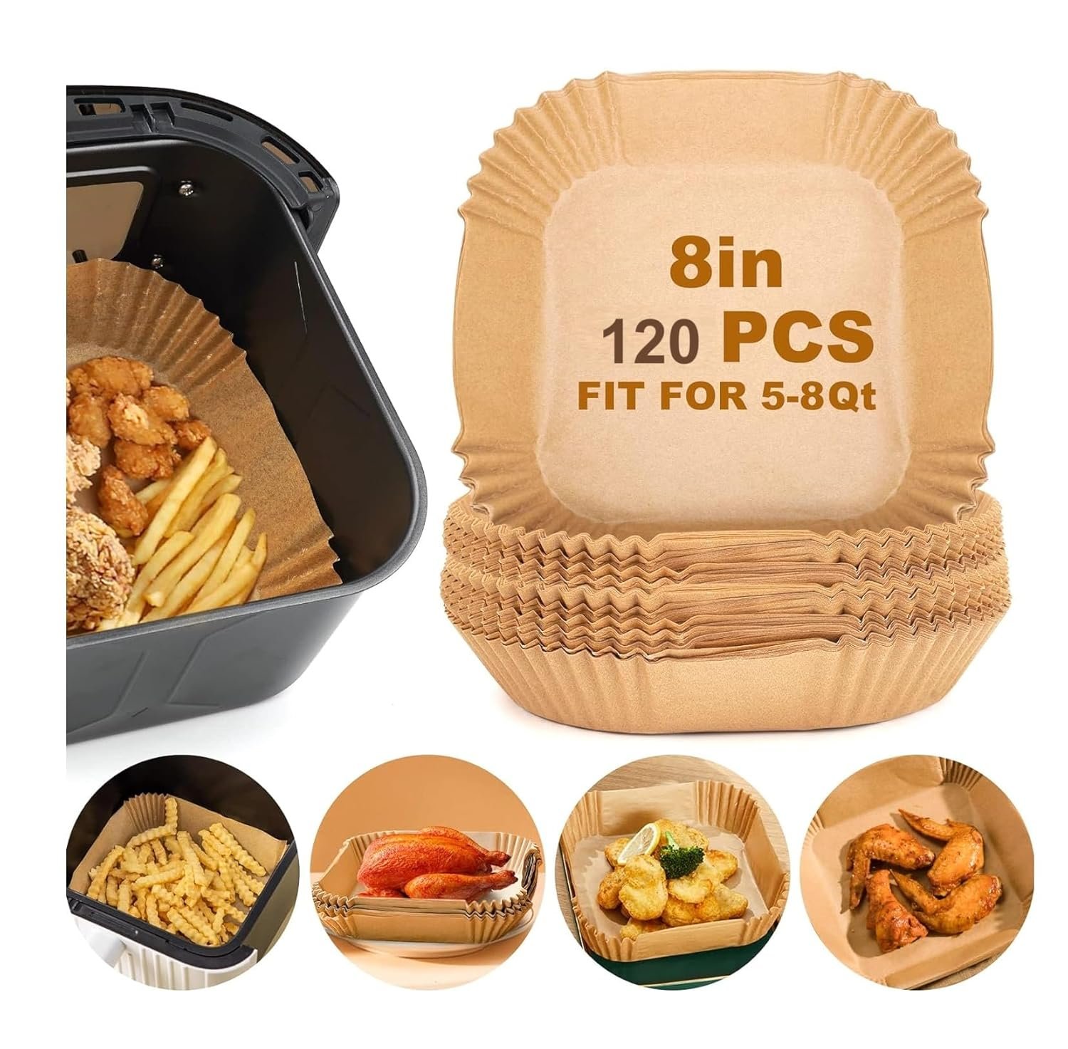 Package Content – Air Fryer Disposable Paper Liner I Material: Paper I Color: Brown I Shape: Round and Square I Size: 7.9 Inch and 8 Inch I 100% Food-Grade I Easy to Clean & Non-Stick I Greaseproof and waterproof I Baking paper for air fryer, microwave oven, oven, steamer, cooking utensils, etc. I chemical-free and toxic-free.
